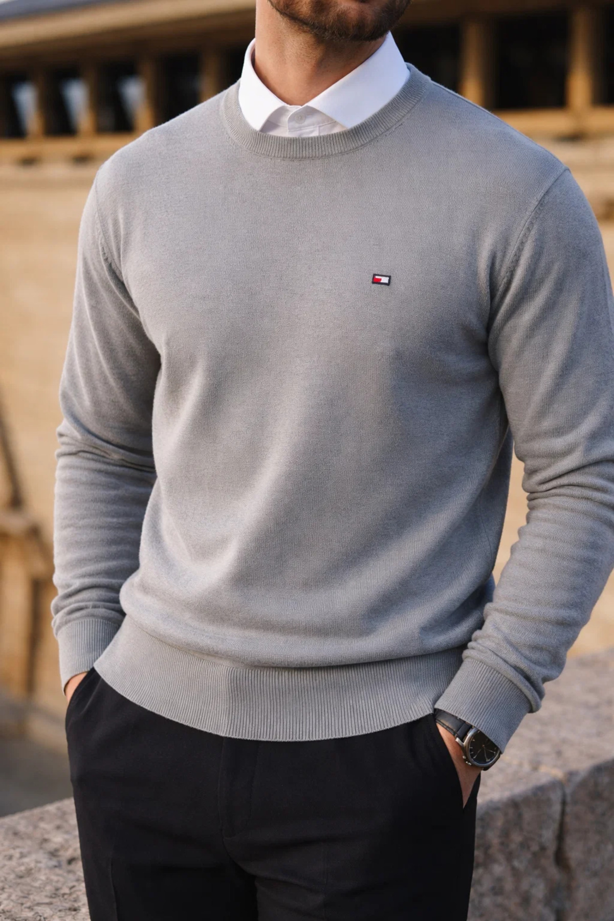 ميزات سترة رجالية شتوية ذات ياقة دائرية ضيقة باللون الرمادي الأساسي من comstar