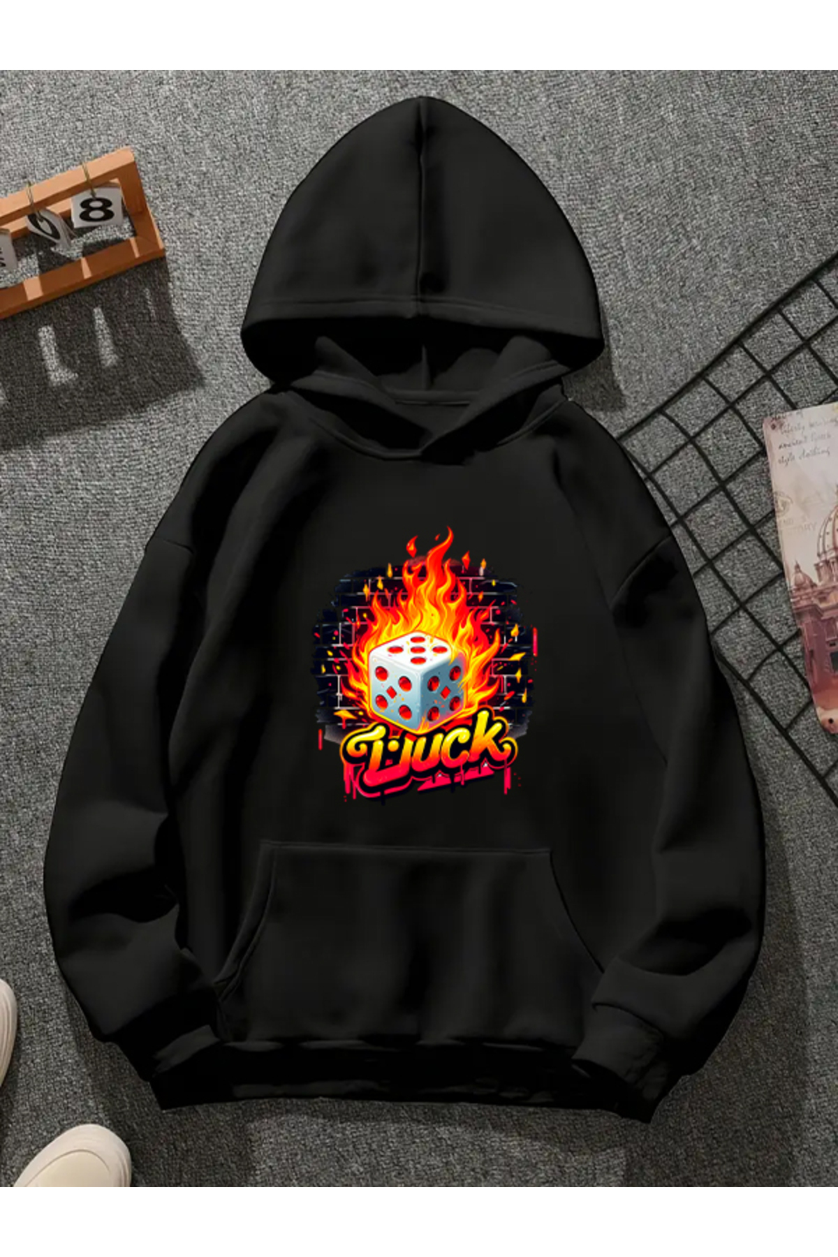 COMVİCHO luck02 سويت شيرت أسود بقلنسوة مطبوعة