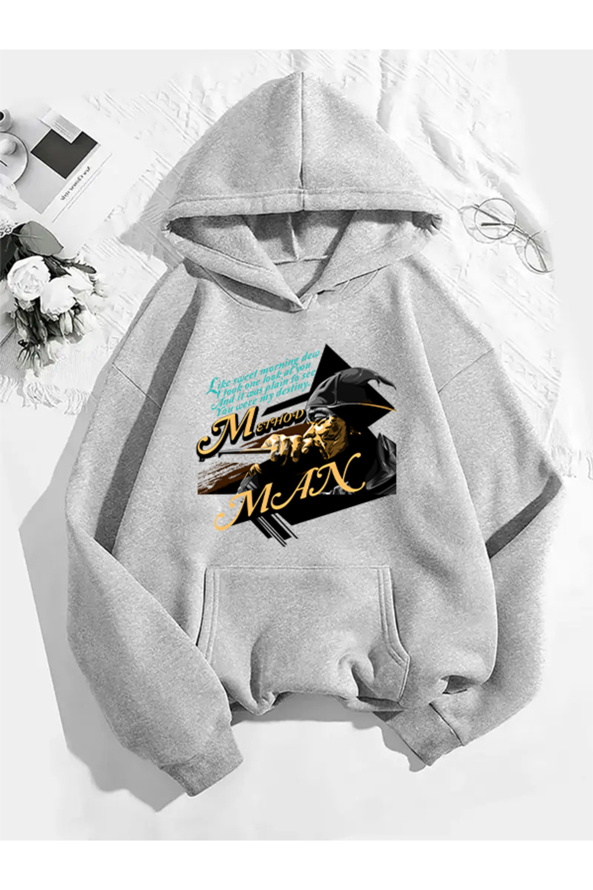 ميزات سويت شيرت رمادي بقلنسوة مطبوعة من ميثود مان v2 من COMVİCHO