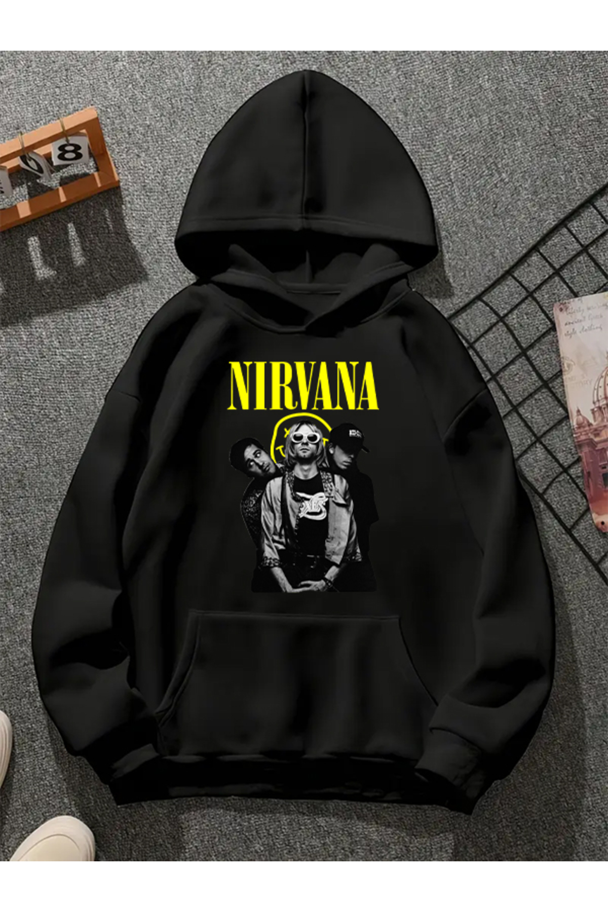 ميزات سويت شيرت أسود بقلنسوة مطبوعة من نيرفانا v2 من COMVİCHO