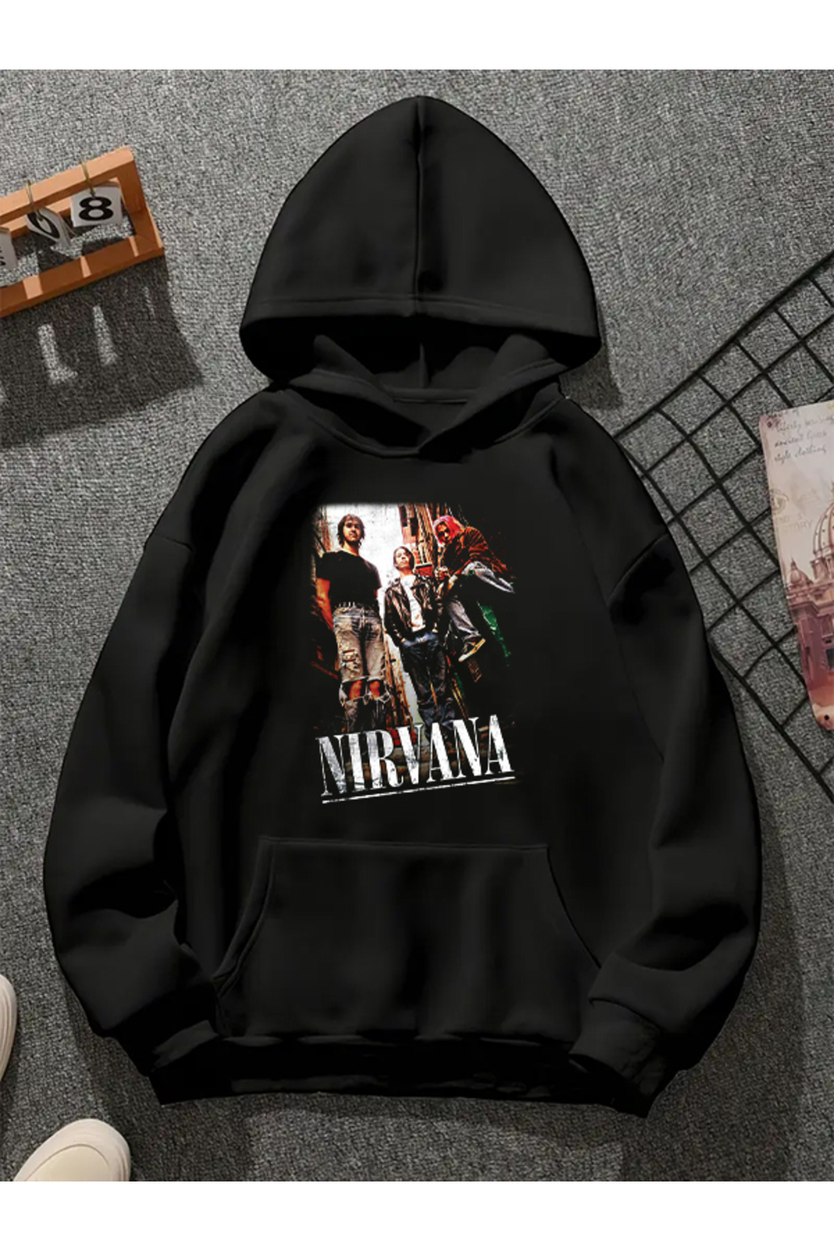 COMVİCHO سويت شيرت أسود بقلنسوة مطبوعة من نيرفانا v3