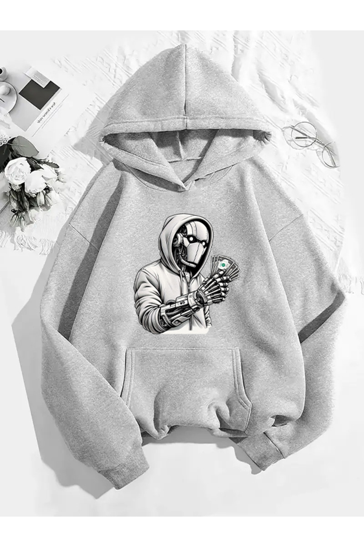 ميزات سويت شيرت رمادي بقلنسوة مطبوع عليه روبوت من COMVİCHO