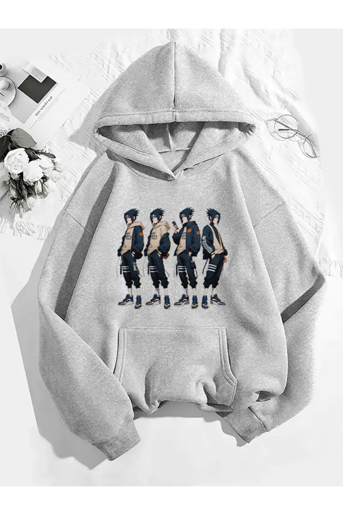 COMVİCHO سويت شيرت رمادي بقلنسوة مطبوع عليه ساسوكي