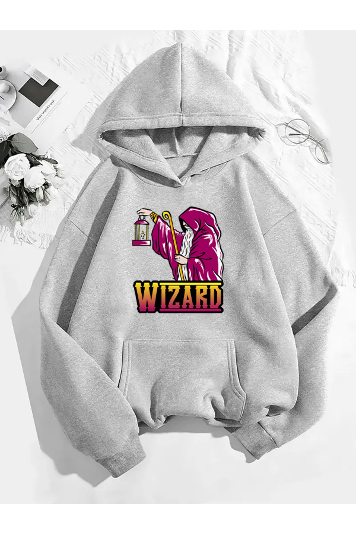 ميزات سويت شيرت رمادي بقلنسوة مطبوع عليه wizard من COMVİCHO