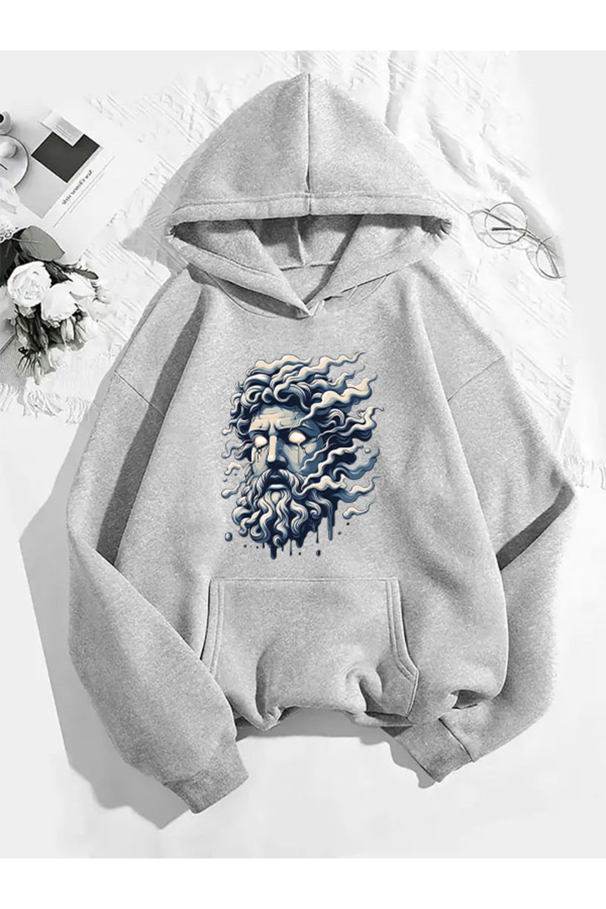 COMVİCHO سويت شيرت رمادي بقلنسوة مطبوع عليه زيوس