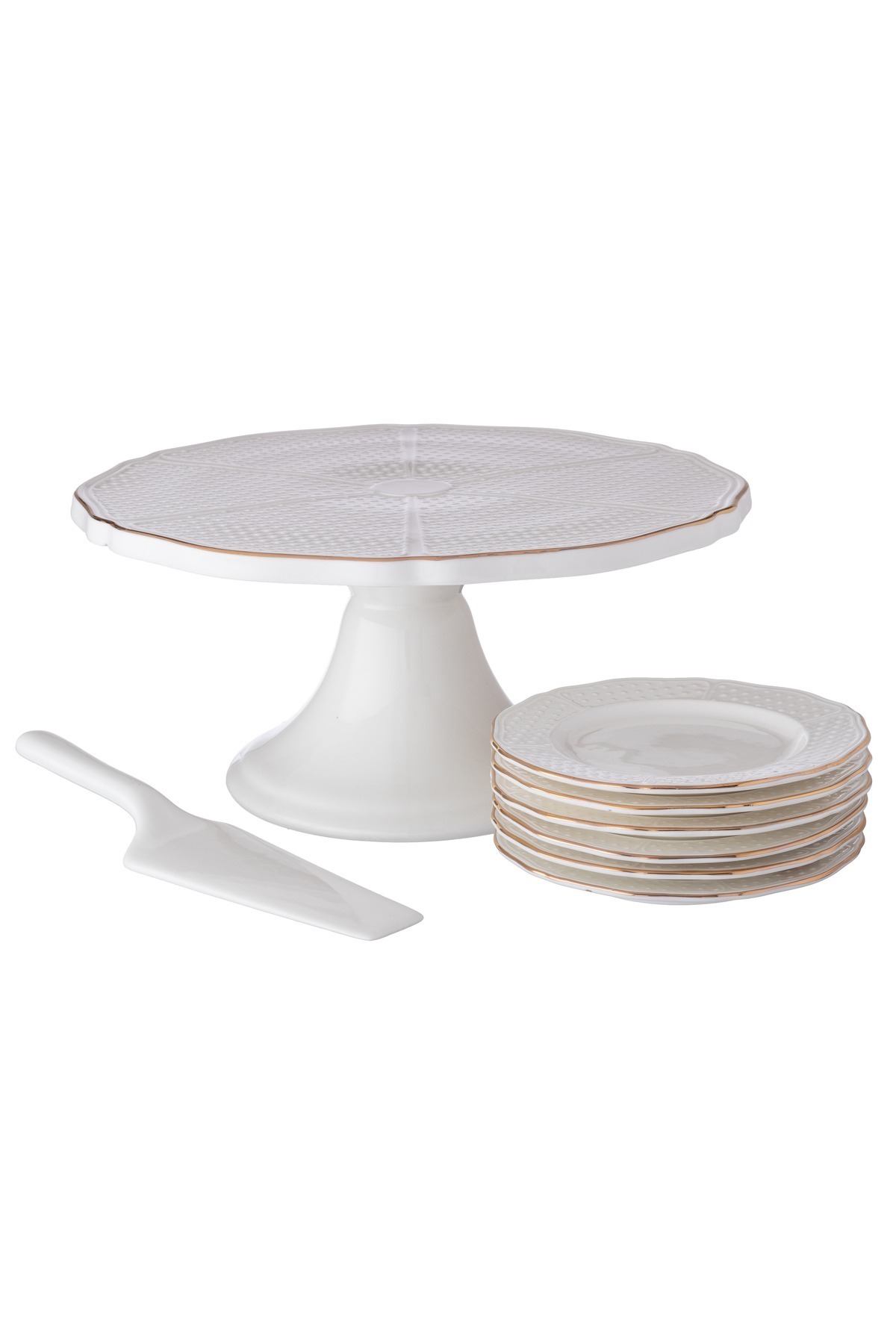 ميزات طقم حامل الكيك مكون من 8 قطع مع أطباق خزفية بيضاء ومغرفة من Dania