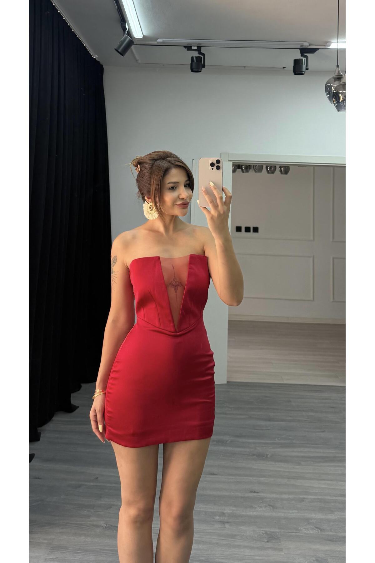 ميزات فستان أحمر قصير بدون حمالات من Daves