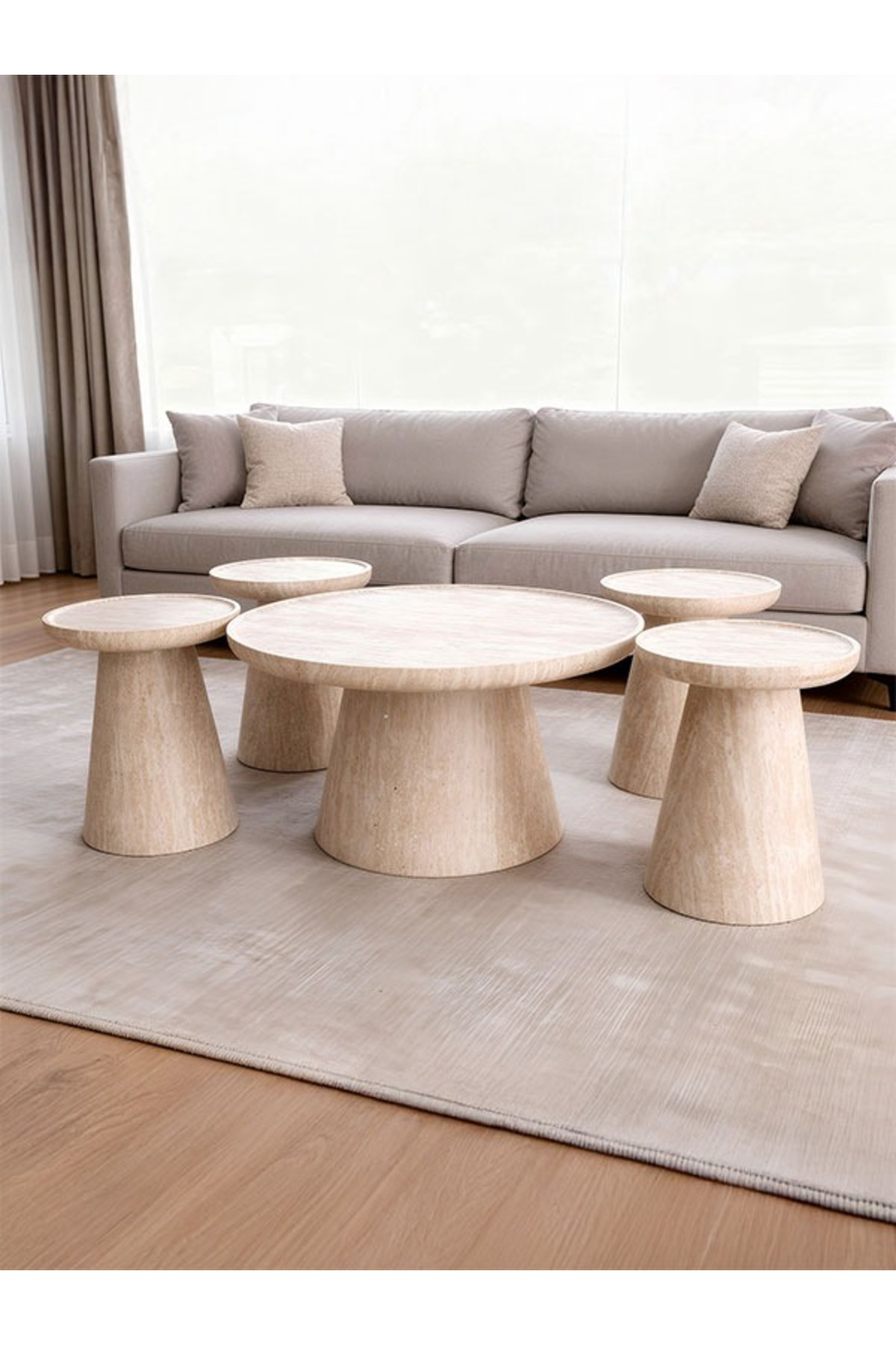 طاولة وسط رئيسية في الصالة أمام الكنبة الطاولات الصغيرة كطاولات خدمة جانبية للمشروبات تجميعها معاً كتشكيلة ديكورية متكاملة استخدامها منفردة في زوايا مختلفة من الغرفة إضافتها للشرفة أو ركن الاسترخاء
