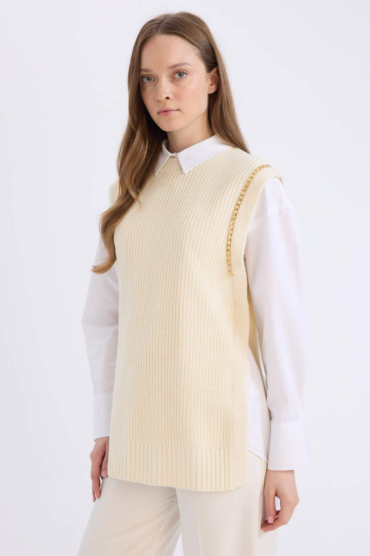 ميزات سترة تريكو أساسية بفتحة جانبية مستقيمة وياقة نصفية D5022AX24AU من DeFacto