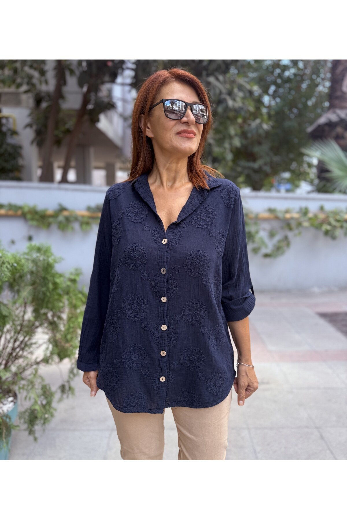 ميزات قميص بتصميم مطرز باللون الأزرق الداكن من DenizEge