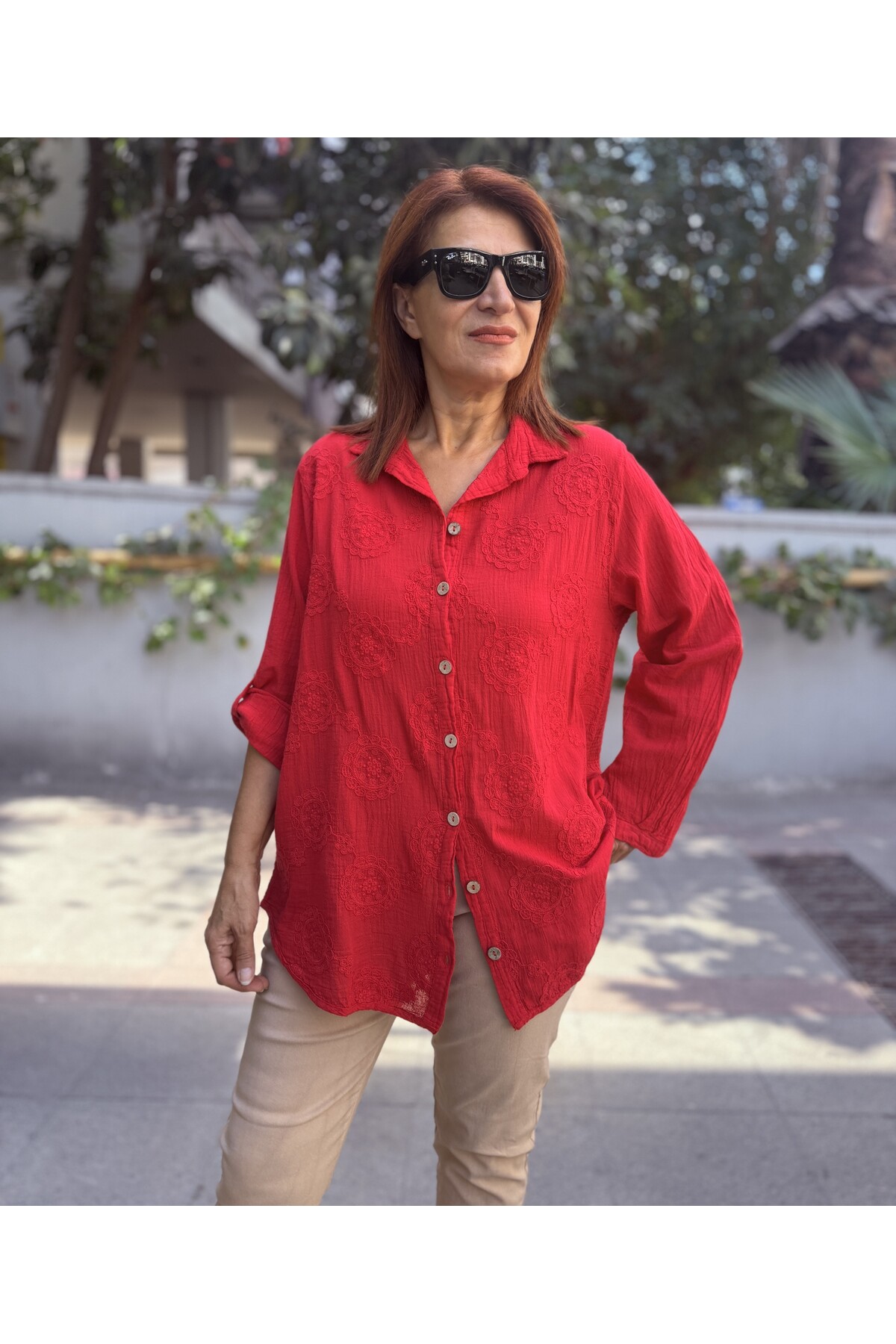 ميزات قميص بتصميم مطرز باللون الأحمر من DenizEge