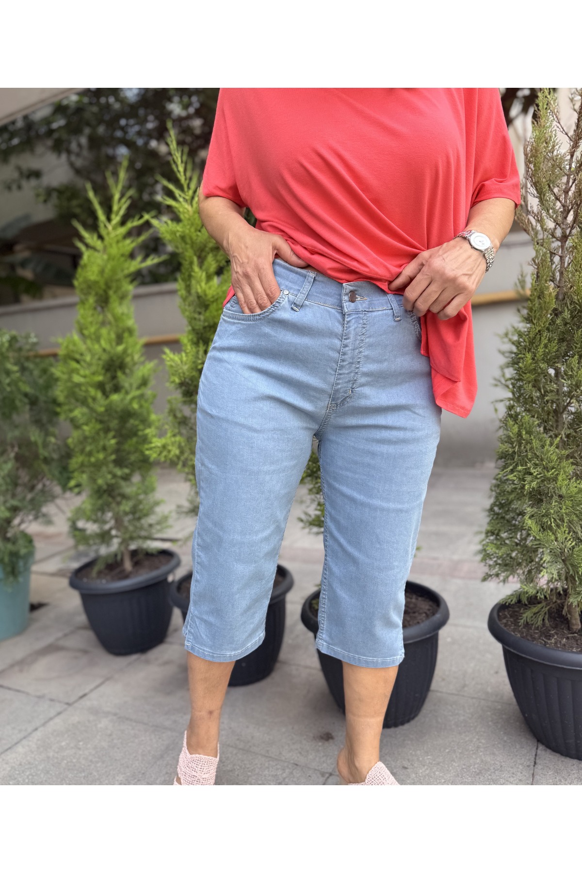 ميزات بنطلون جينز كابري مفتوح باللون الأزرق من DenizEge