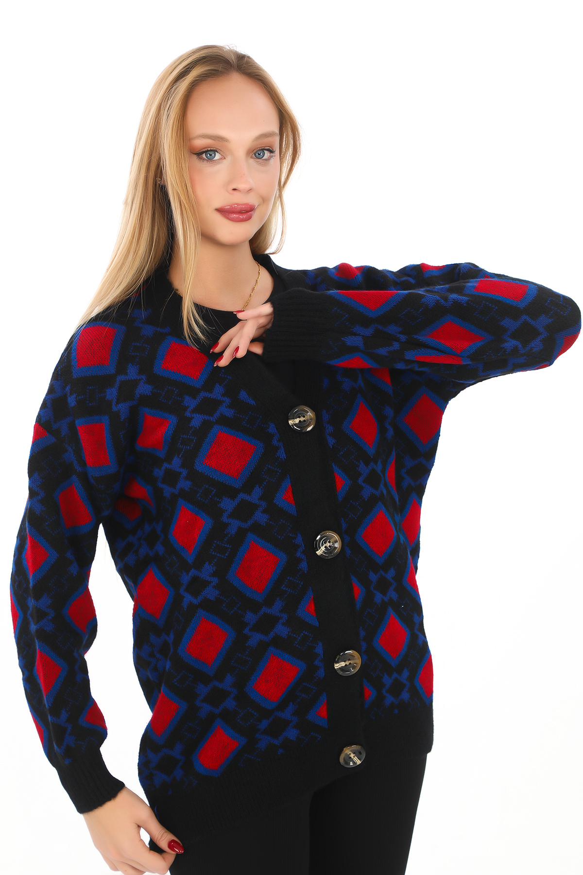 ميزات سترة صوفية محبوكة بنمط مربع وأزرار من dignus