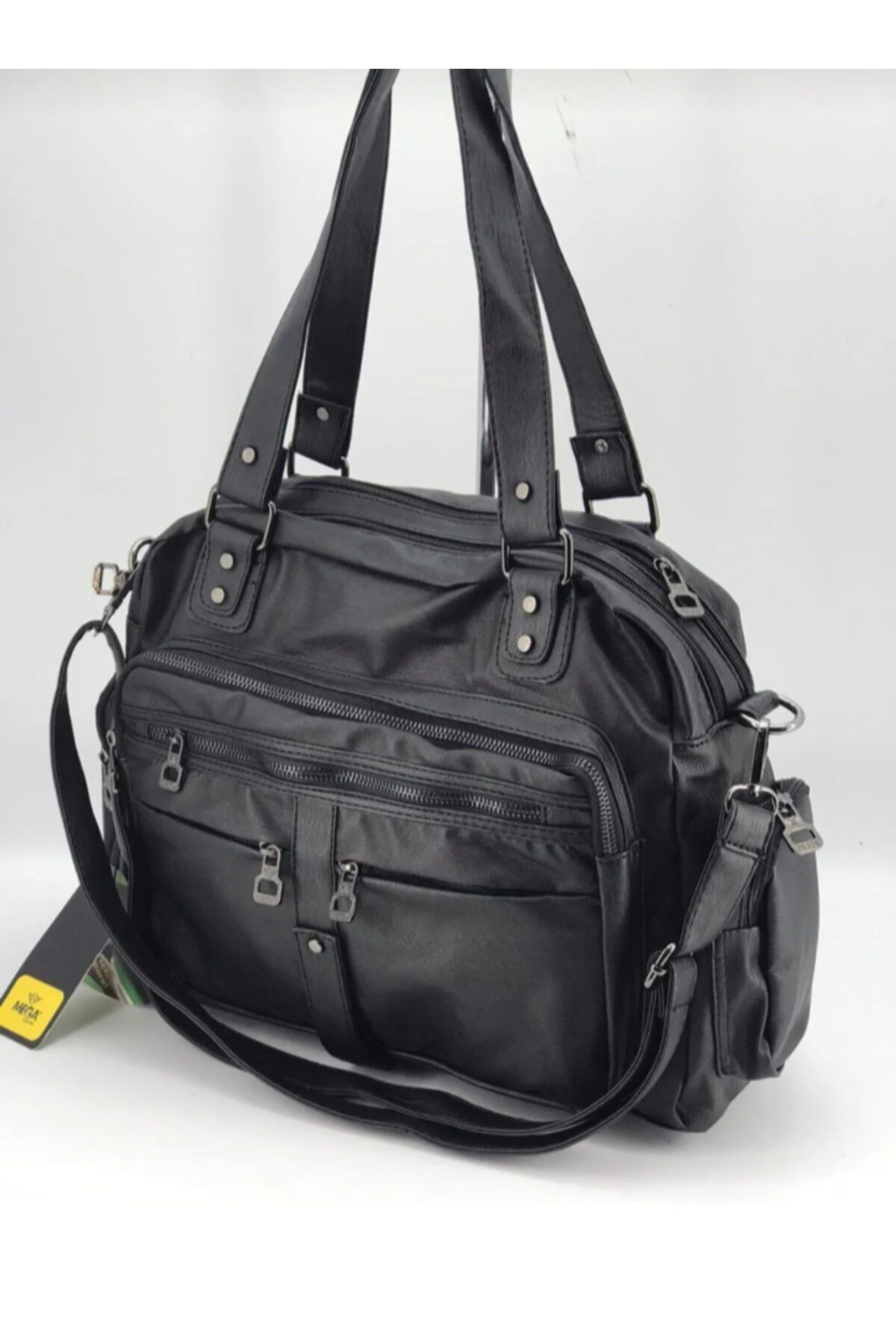 eflanmoda حقيبة كتف ميجا سوداء متعددة الأقسام من الجلد المغسول