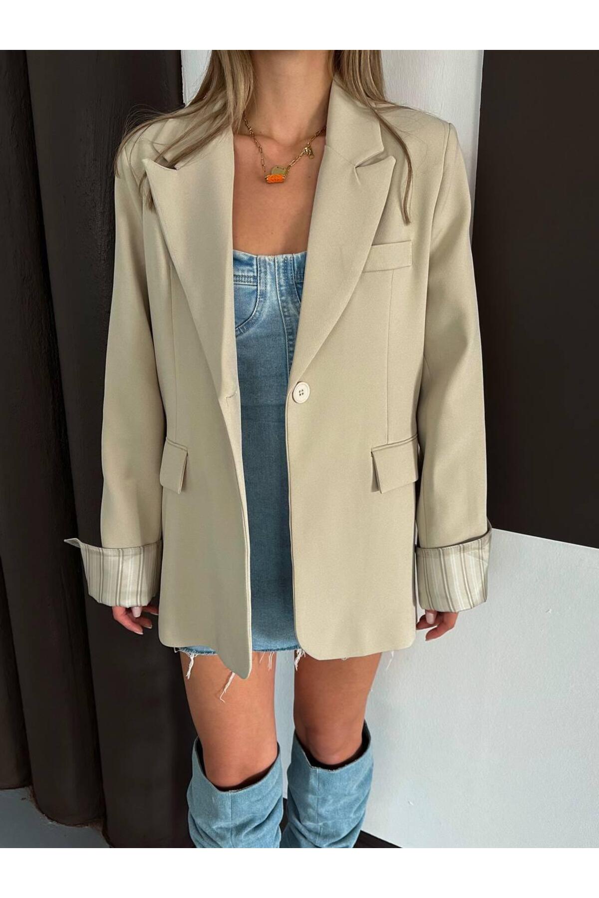 ميزات سترة بليزر مبطنة مخططة من Ekim Store