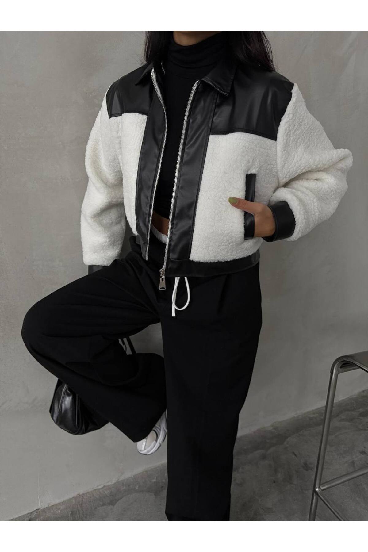 ميزات سترة جراسو تيدي من الجلد المختلط من elbisereyonda