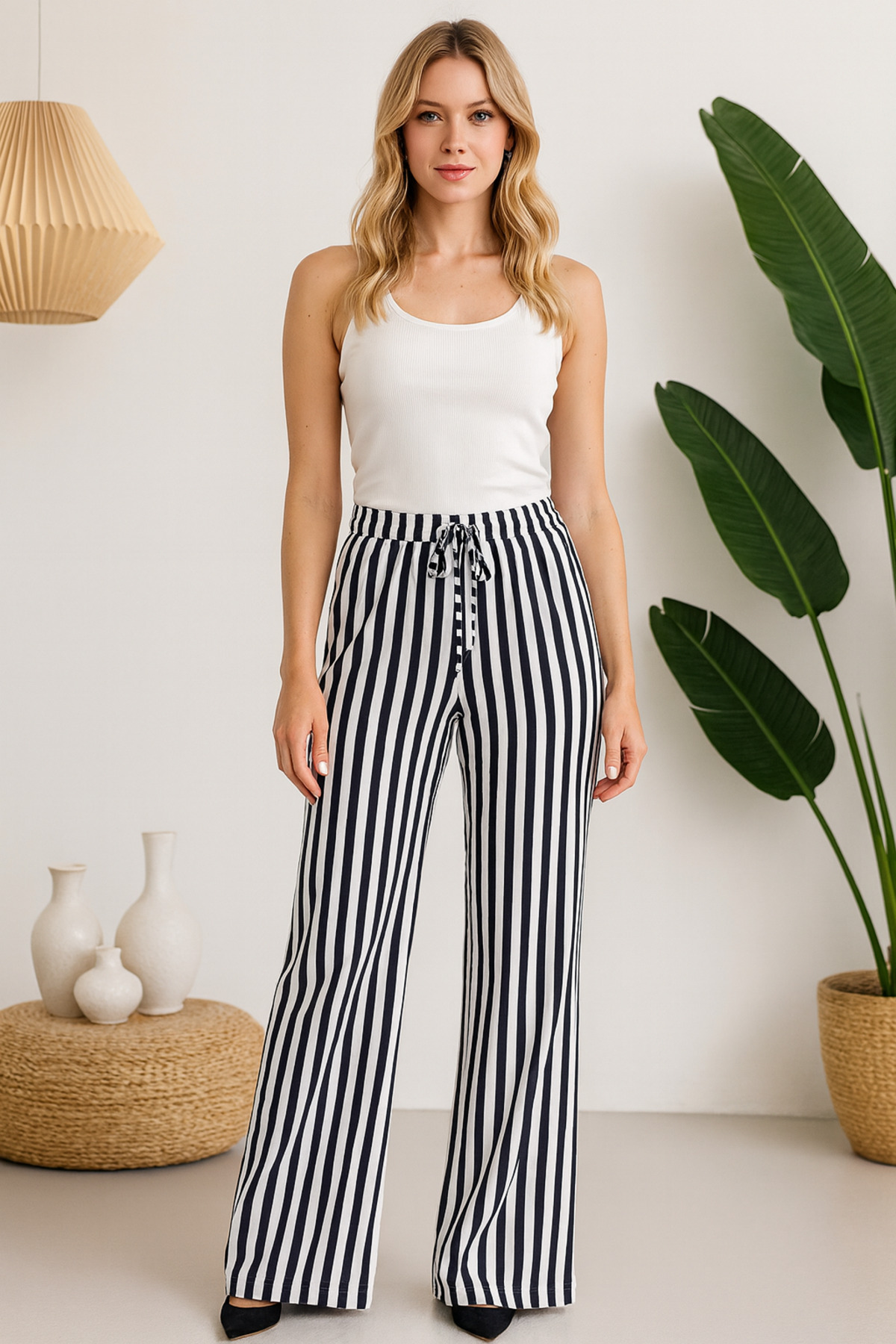 ميزات بنطلون أساسي بخطوط عمودية باللونين الأسود والأبيض من ELMODA