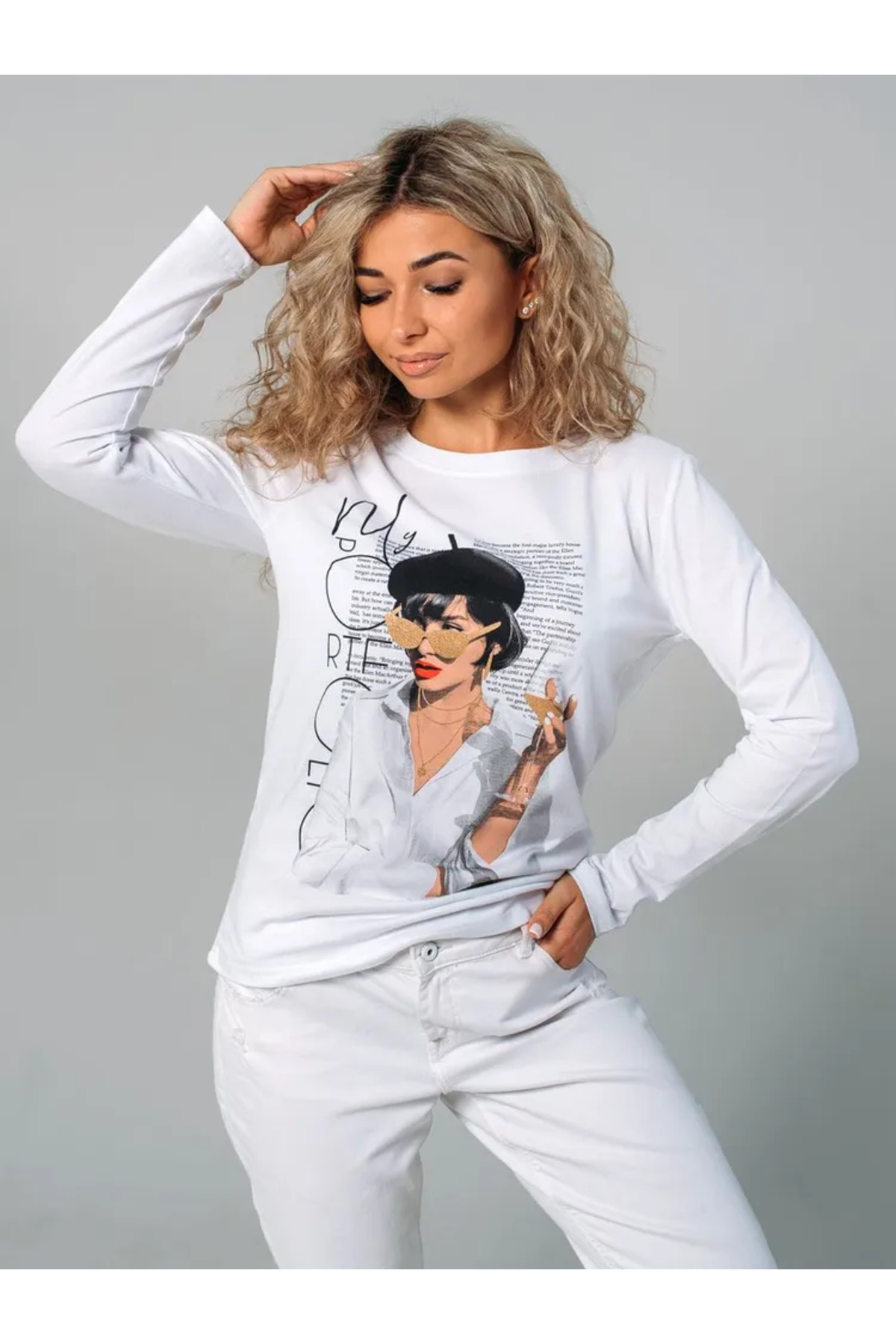 ميزات سترة بيضاء قصة فضفاضة مطبوع أساسية بأكمام طويلة من ELNOYA
