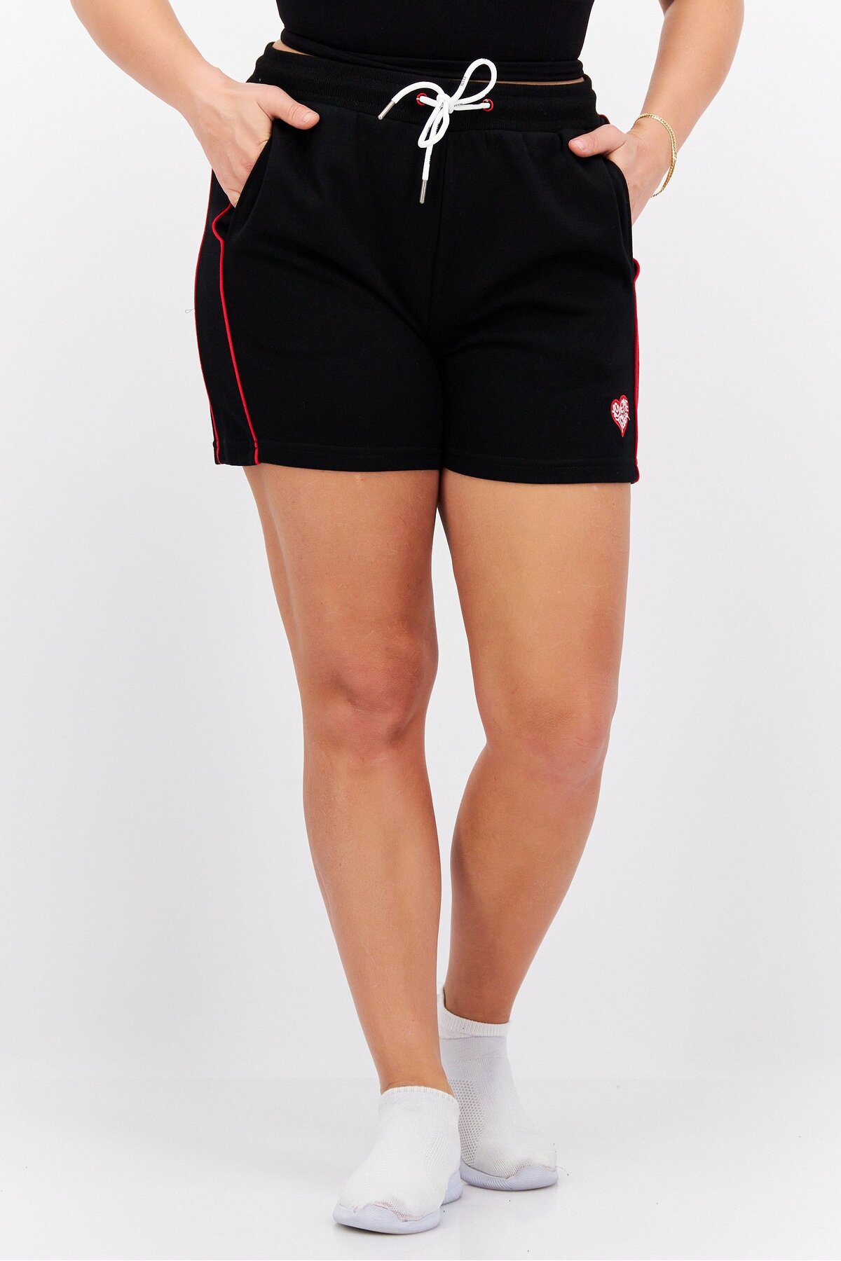 ميزات شورت نسائي أساسي برباط وجيوب جانبية ورقعة على شكل قلب، أسود من Elvis