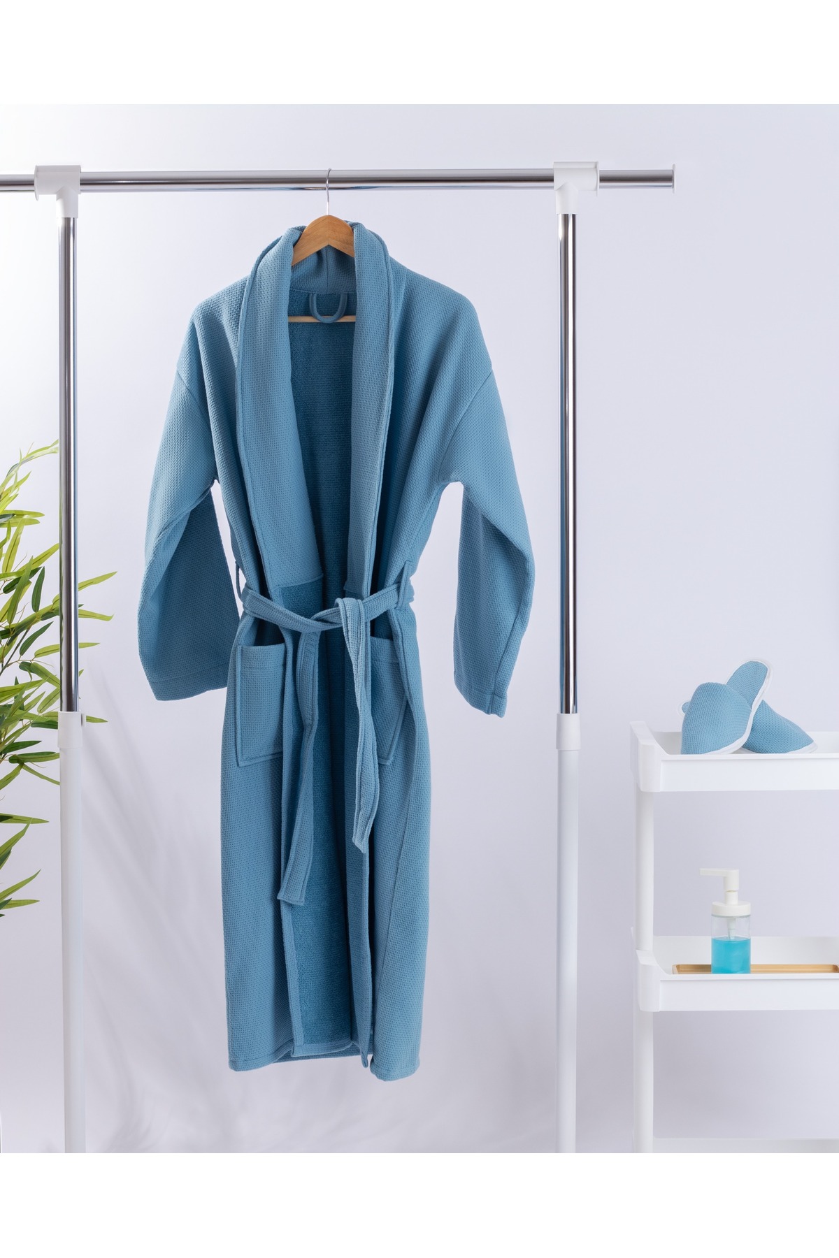 يتميز روب Enaq بلونه الأزرق الجذاب وتصميمه الماكسي الذي يغطي الجسم بالكامل، ليمنحك خصوصية وراحة تامة. بفضل خامته القطنية الفاخرة، ستشعرين بنعومة فائقة على البشرة وامتصاص سريع للماء، ما يجعله مثاليًا بعد الاستحمام أو حتى للاسترخاء في المساء.