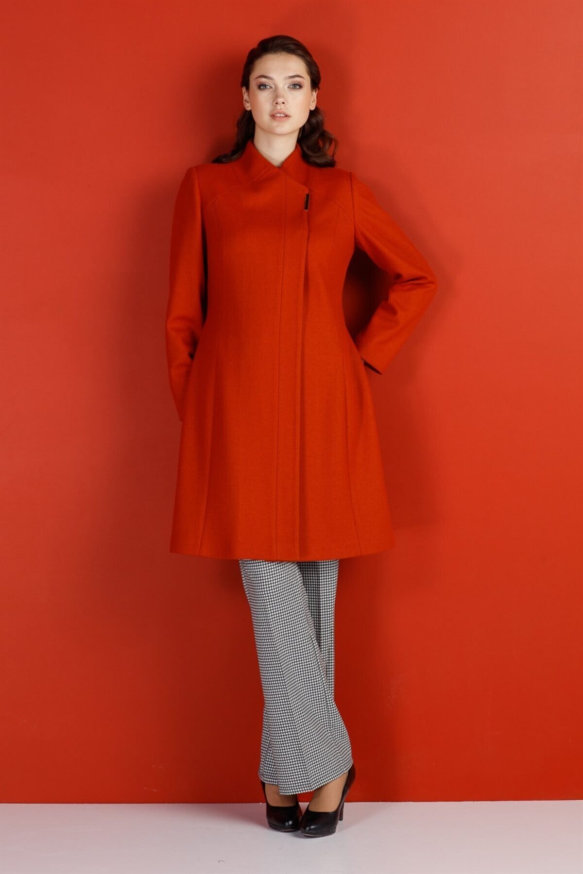 ميزات معطف بدون ياقة بأزرار كبس برتقالي من Esswaap