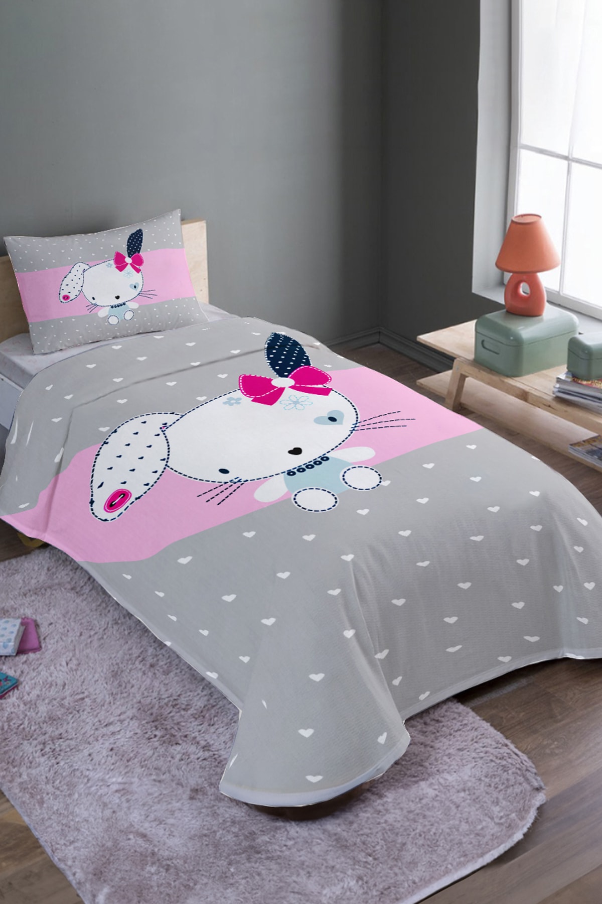 ميزات طقم بيكيه فردي من القماش الرمادي على شكل أرنب ومفرش سرير من EVPANYA