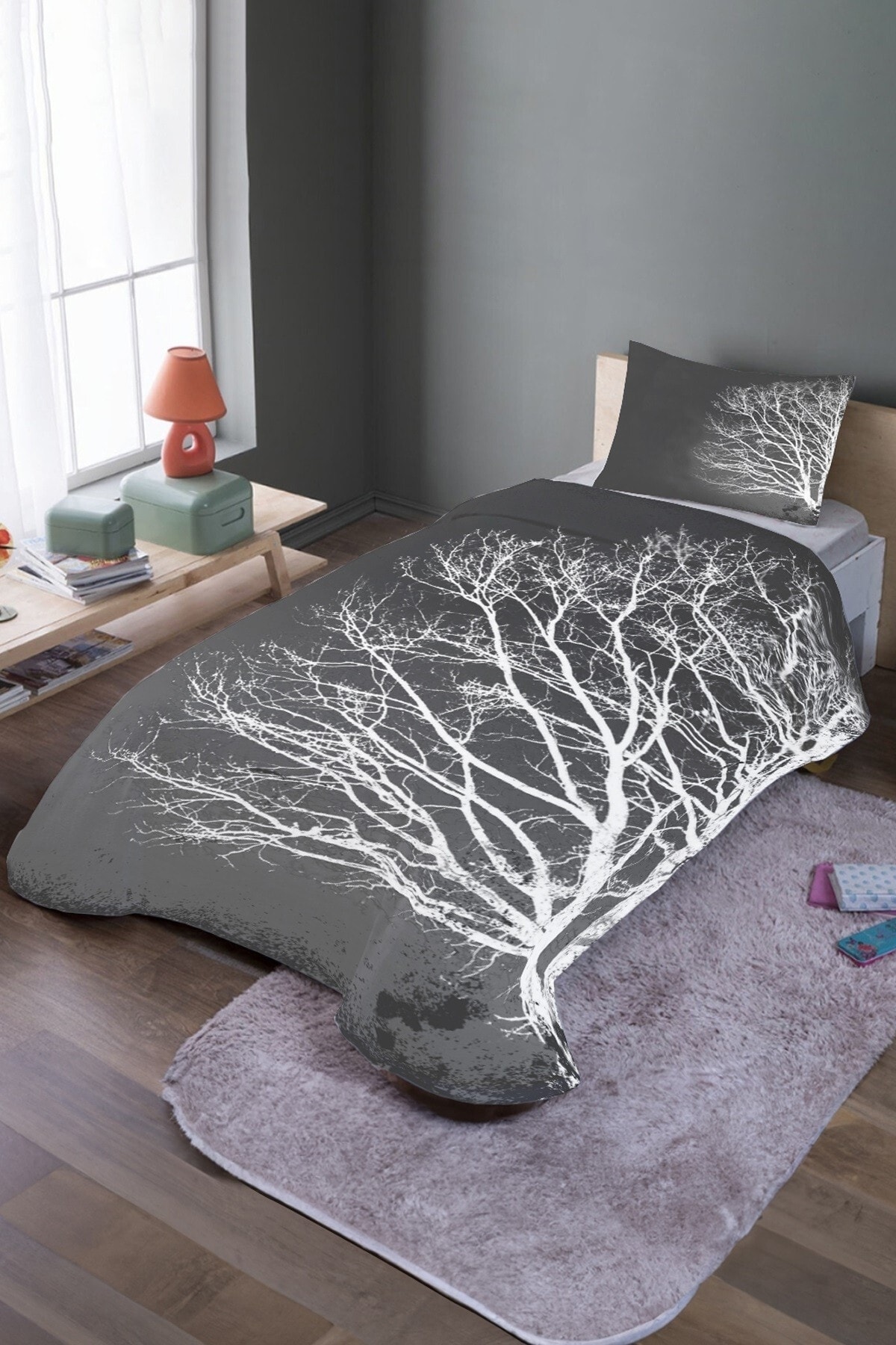 ميزات طقم مفرش سرير فردي وبيكيه بنمط شجرة رمادية من EVPANYA