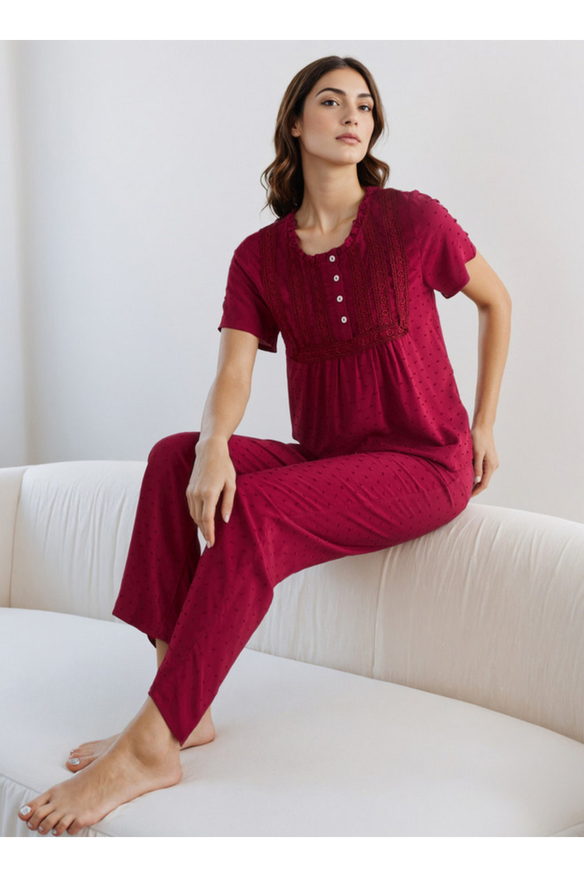 ميزات طقم بيجامة من أعلى وبنطال من الرايون مع أزرار من FAV