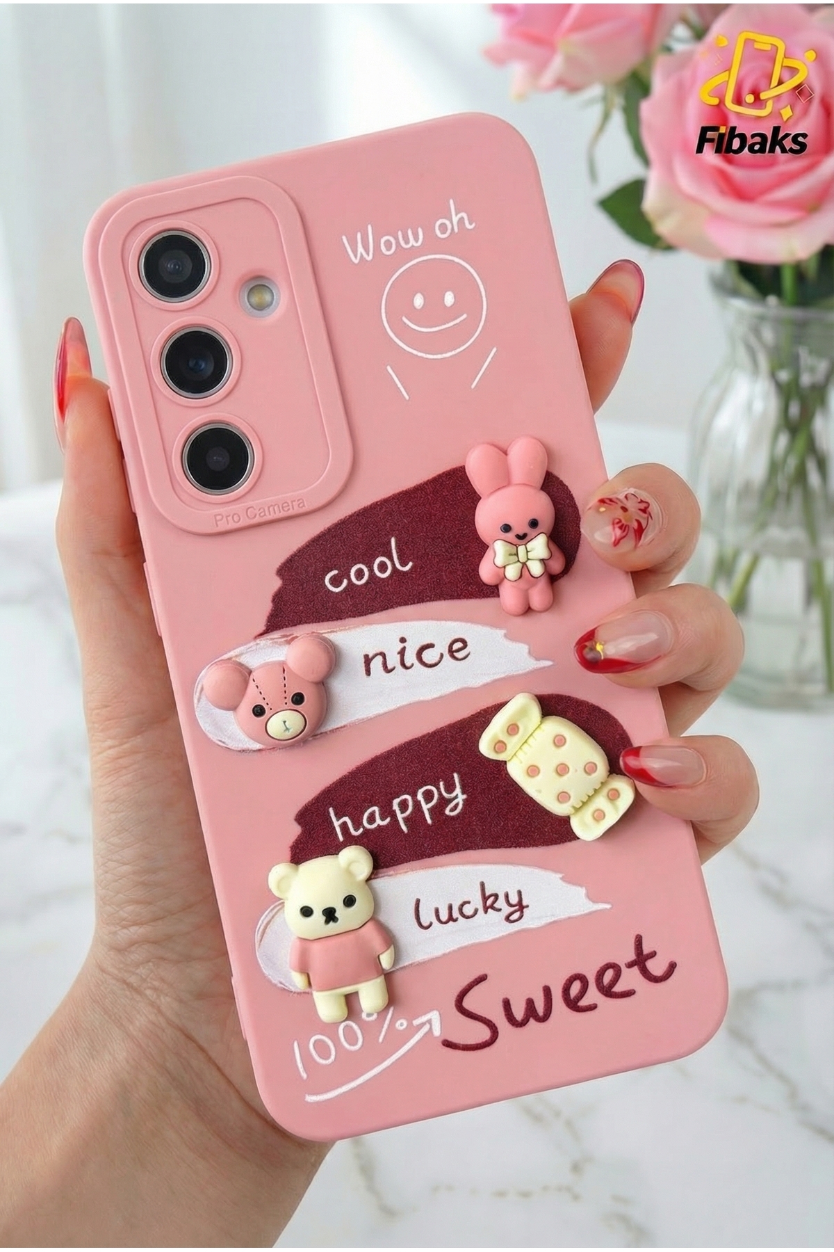 ميزات حافظة لهاتف Galaxy A25 مصممة بنمط حماية للكاميرا، غطاء من السيليكون الناعم باللون الوردي على شكل أرنب من Fibaks