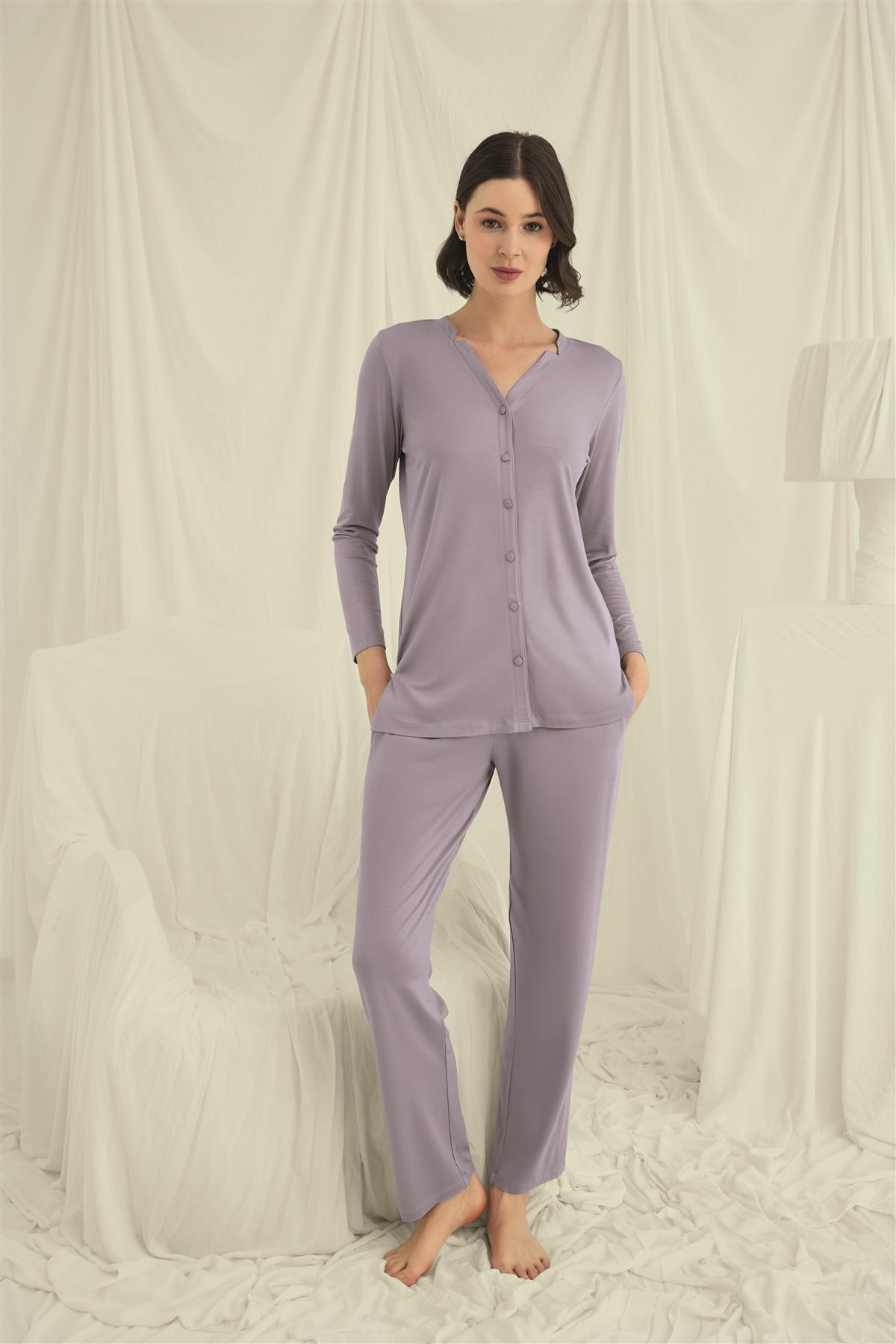 ميزات طقم بيجامة بأكمام طويلة وياقة على شكل حرف V وأزرار طويلة من Findit