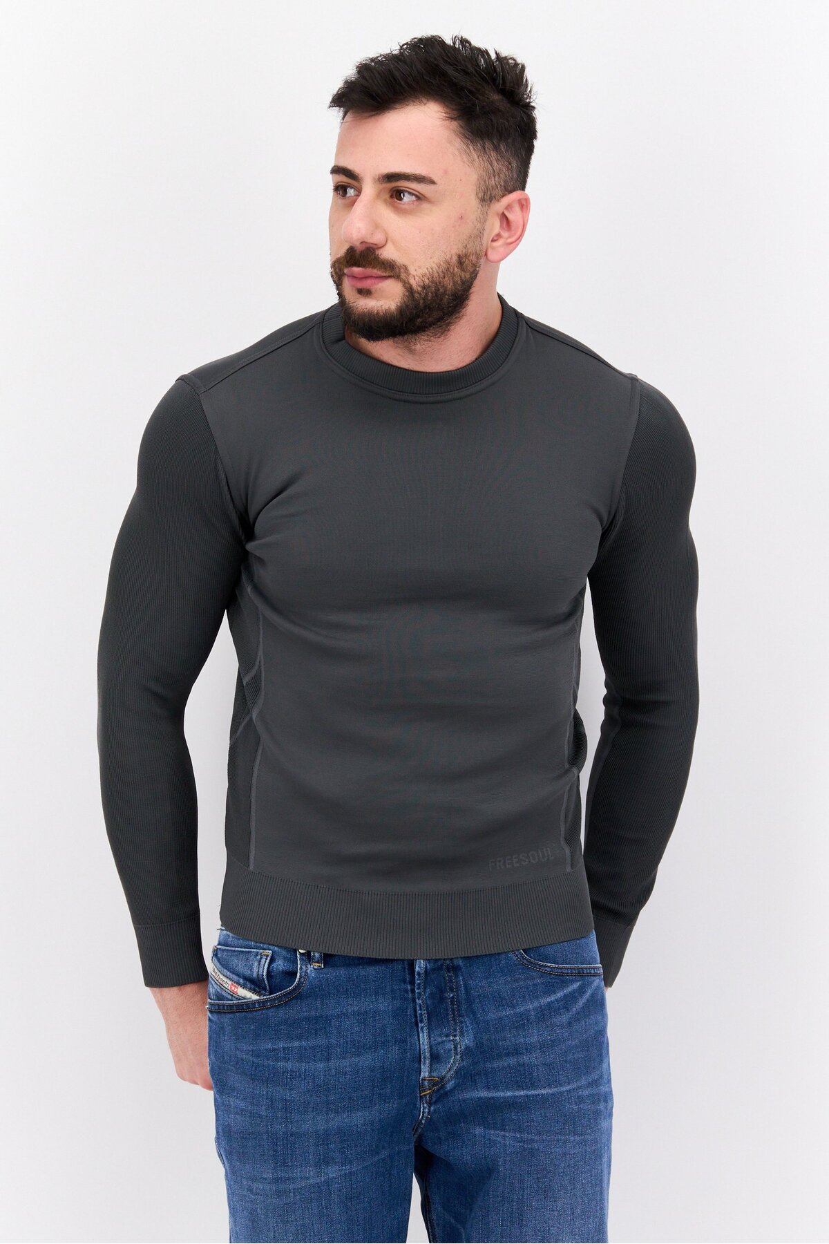 freesoul سويت شيرت رجالي سادة بأكمام طويلة وياقة دائرية، رمادي