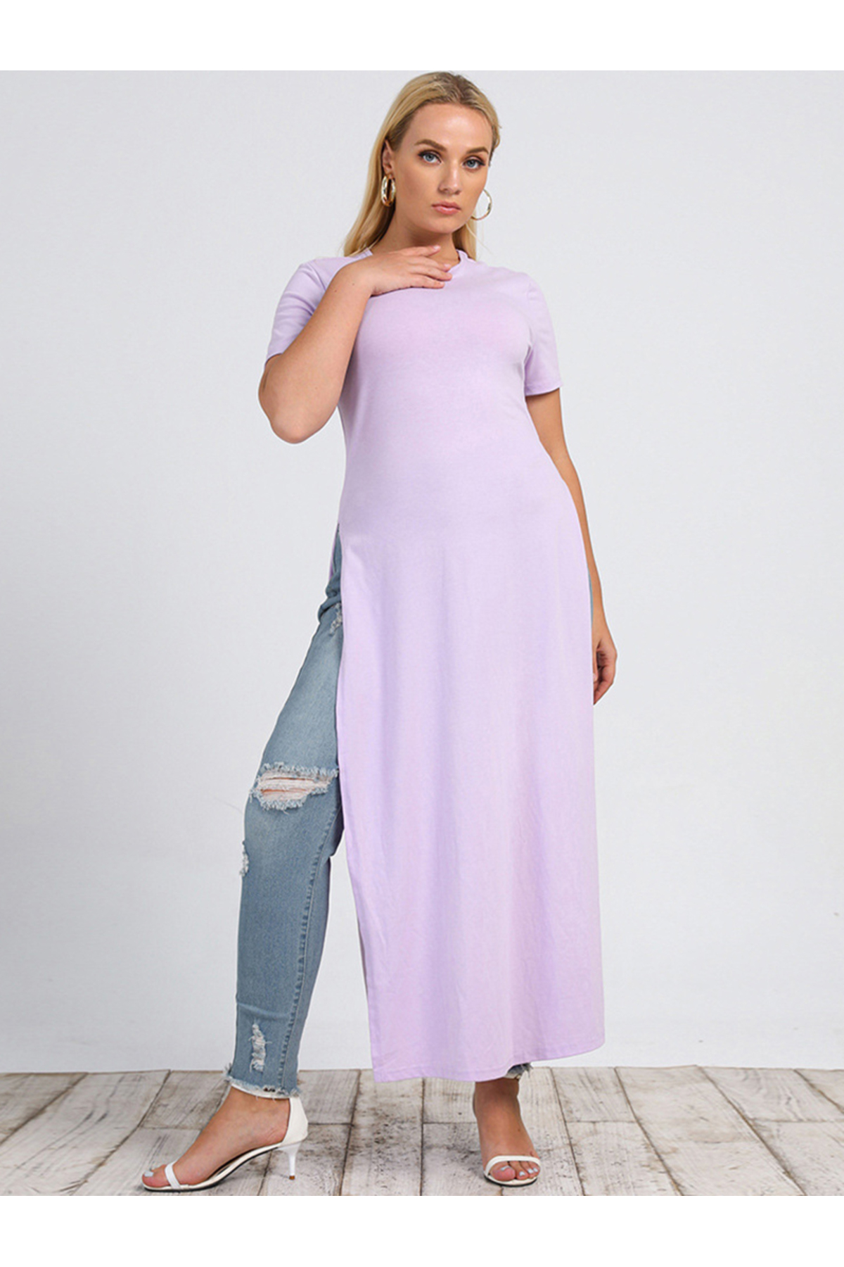 FridayIn فساتين كاجوال برقبة لون سادة موحد وأكمام عادية بمقاسات كبيرة
