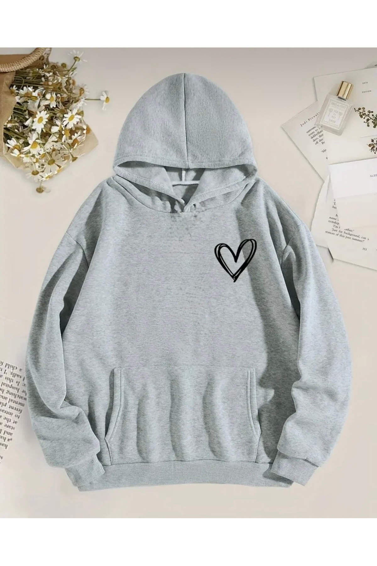 FUFLUNS سويت شيرت كبير الحجم مطبوع عليه قلب صغير