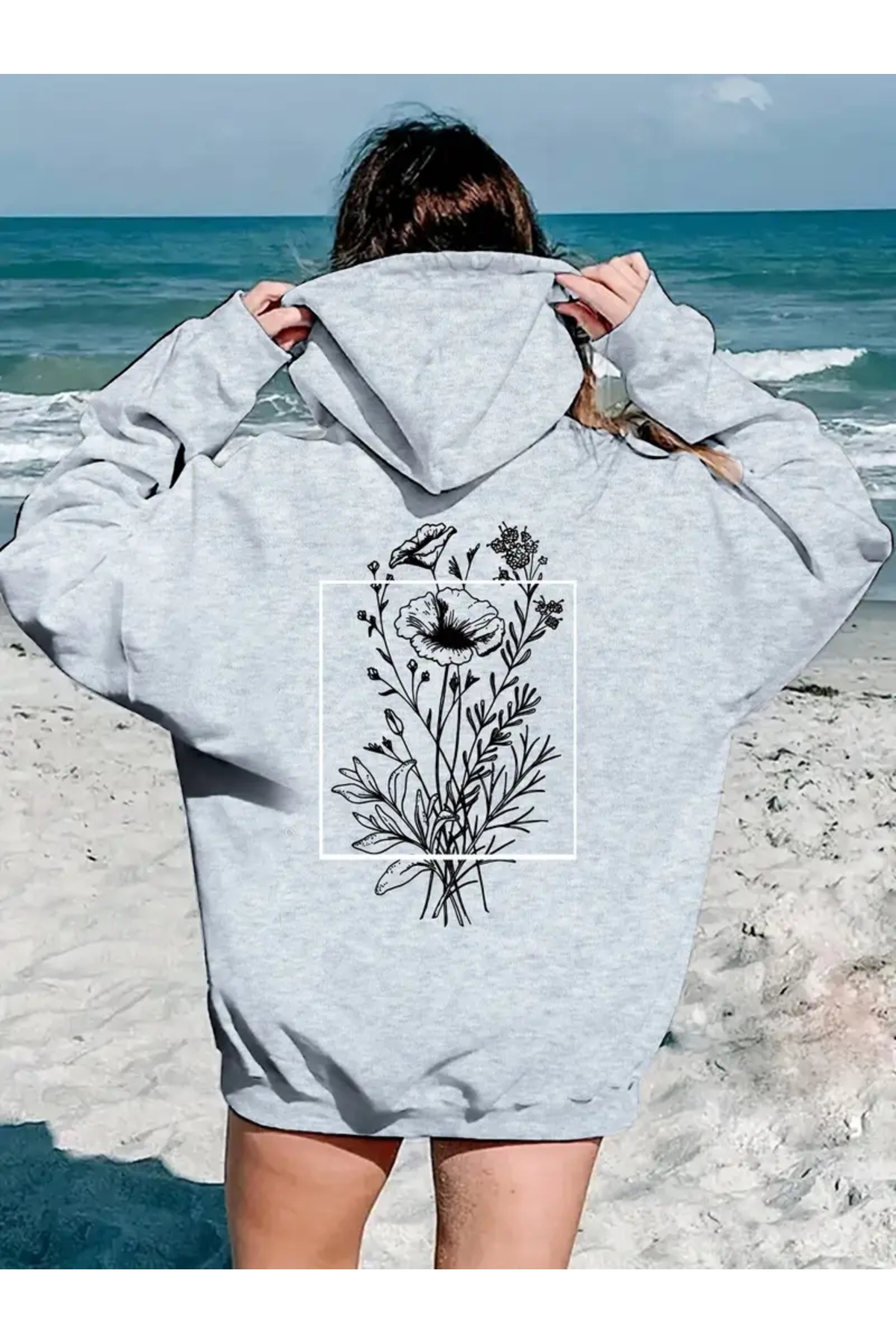 FUFLUNS سويت شيرت كبير الحجم مطبوع عليه زهرة من الخلف