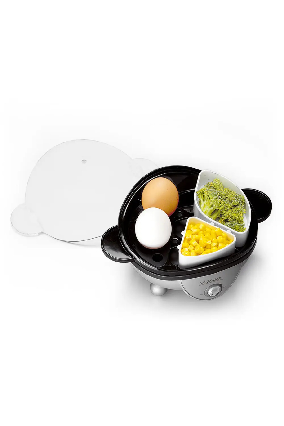 Includes measuring cup with scale (for soft and hard eggs) and piercing needle. Features light control, acoustic signal, dry-out protection, and cord storage.