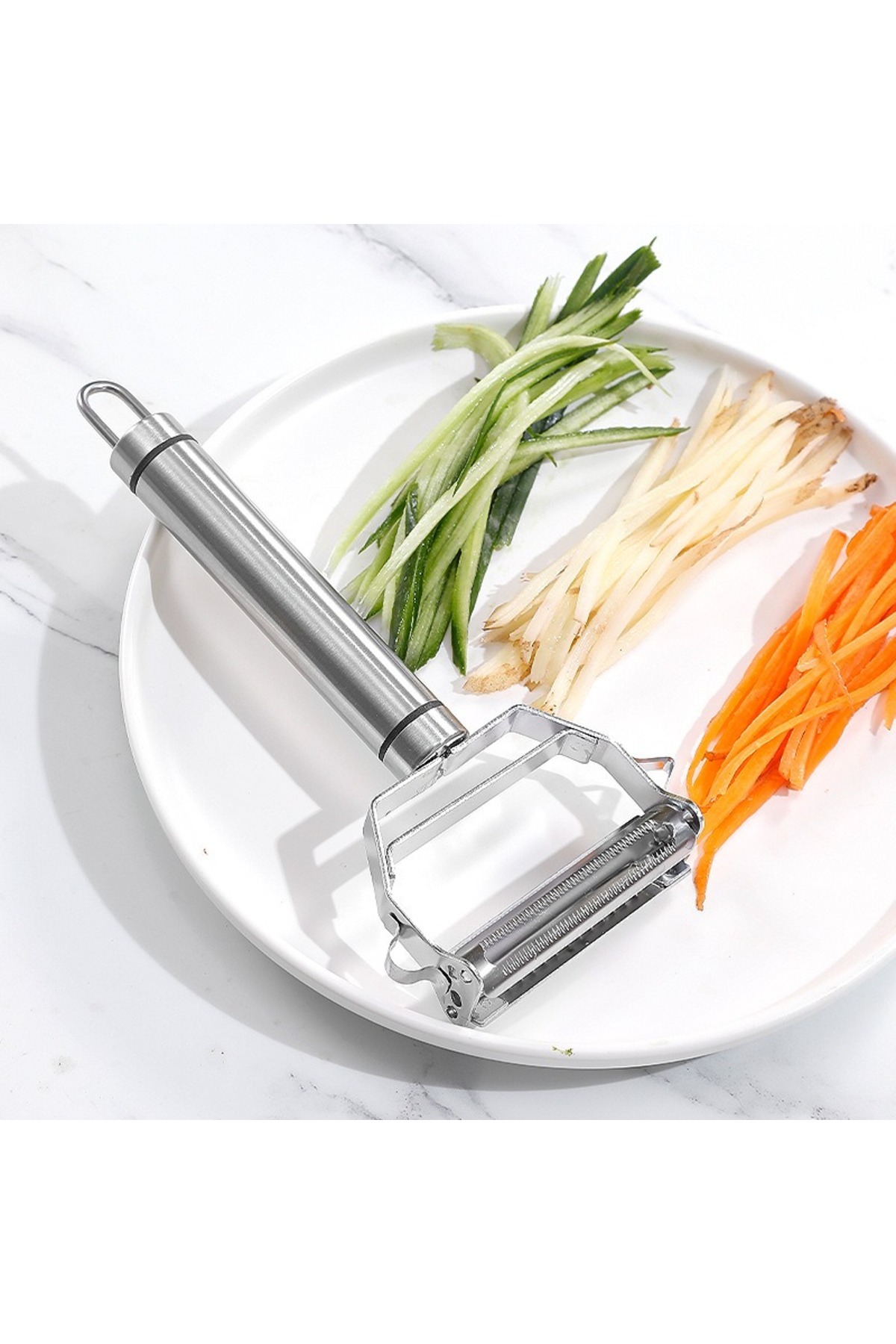 * تصميم الرأس المزدوج/متعدد الشفرات: قد يحتوي الرأس على أكثر من نوع من الشفرات (جوليان، تقشير عادي، إلخ) في إطار واحد. * مقشرة الجوليان: هي الميزة الأساسية، حيث تنتج شرائح بسمك موحد (عادة 3 مم - 5 مم). * فتحة تعليق: يوجد حلقة معدنية في نهاية المقبض لسهولة التخزين والتعليق. * مقبض مريح: المقبض مصنوع من الفولاذ بتصميم أسطواني صلب لسهولة التحكم والإمساك به.