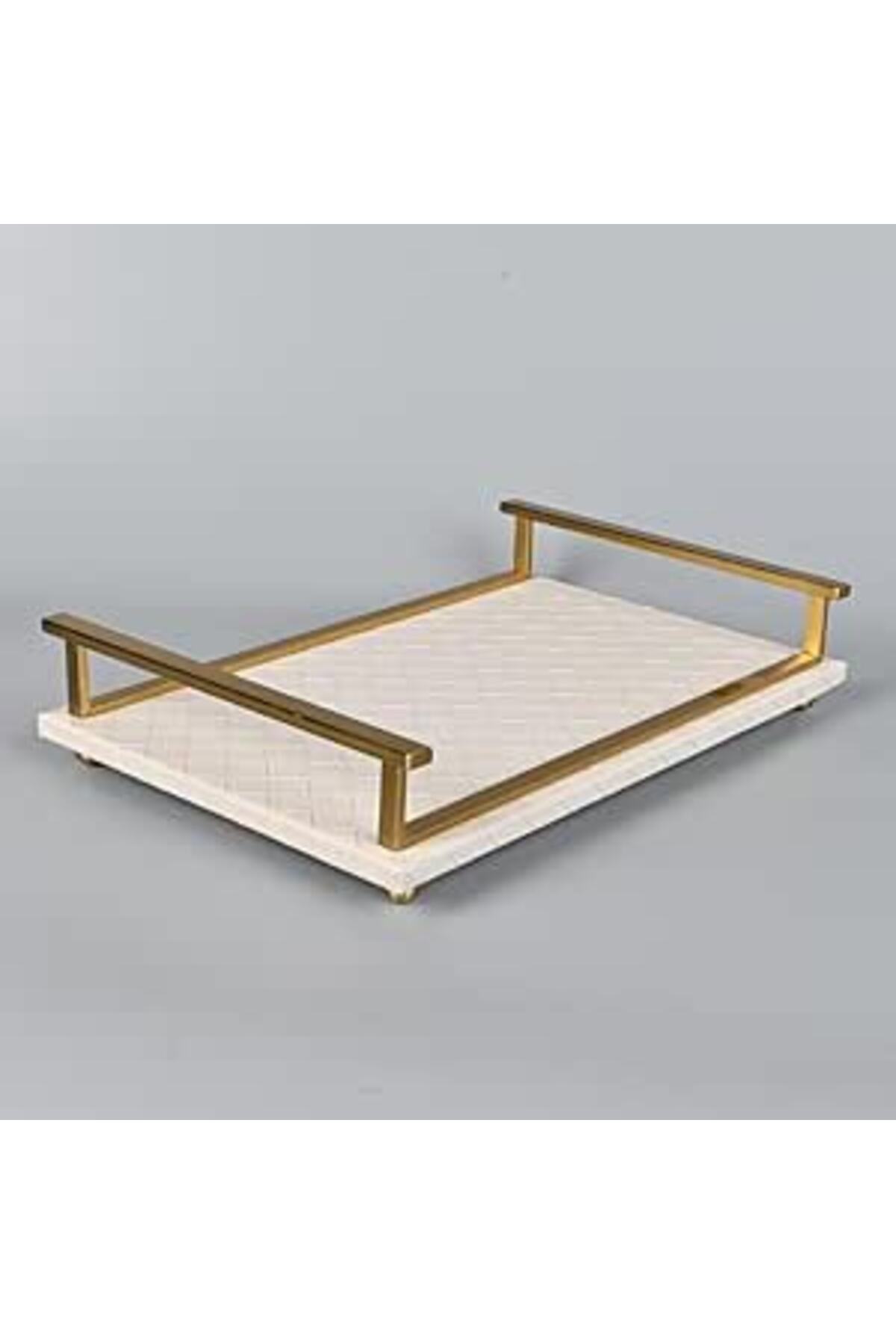 ميزات صينية تقديم مستطيلة 40 × 26 سم، مصنوعة من الجلد الرمادي الفاتح بإطار من الفولاذ النحاسي من Generic