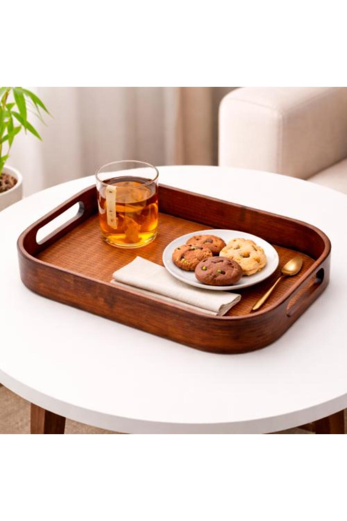 Generic صينية تقديم خشبية مستطيلة بقاعدة منسوج