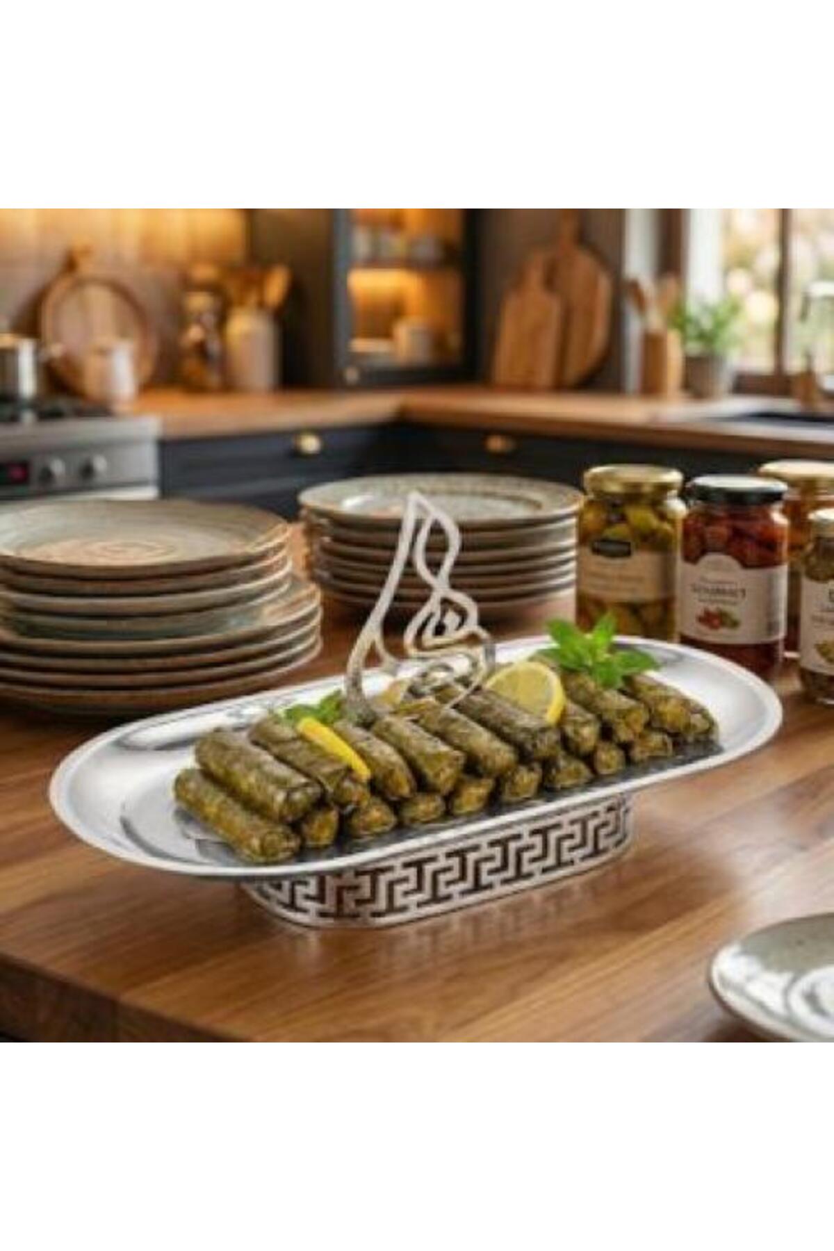 ميزات طبق تقديم فضي بنقشة فرزاتشي، بقاعدة مزخرفة وكتابة عربية. من Generic