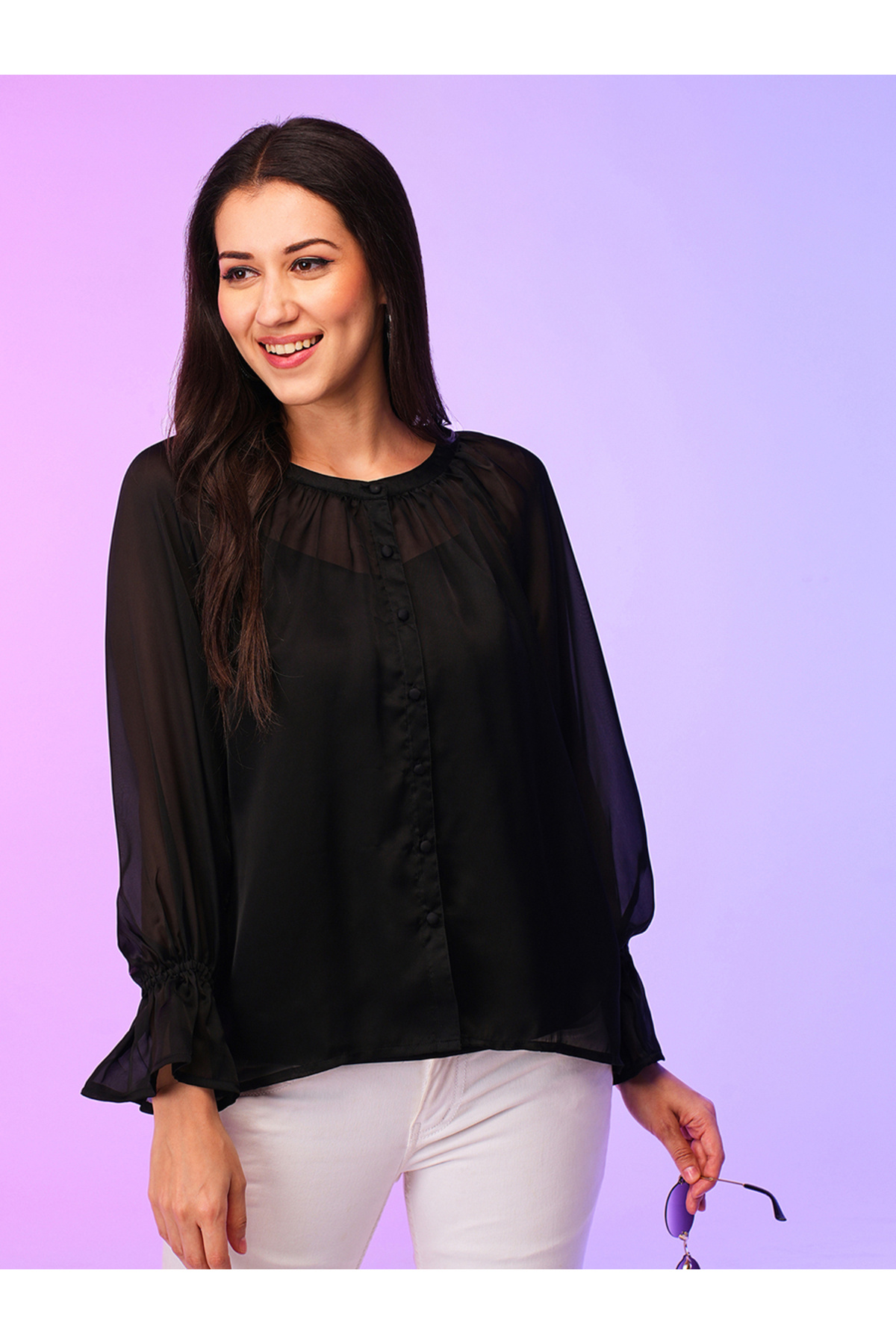 ميزات بلوزة سادة برقبة دائرية وأكمام فلوت من Globus By Styli