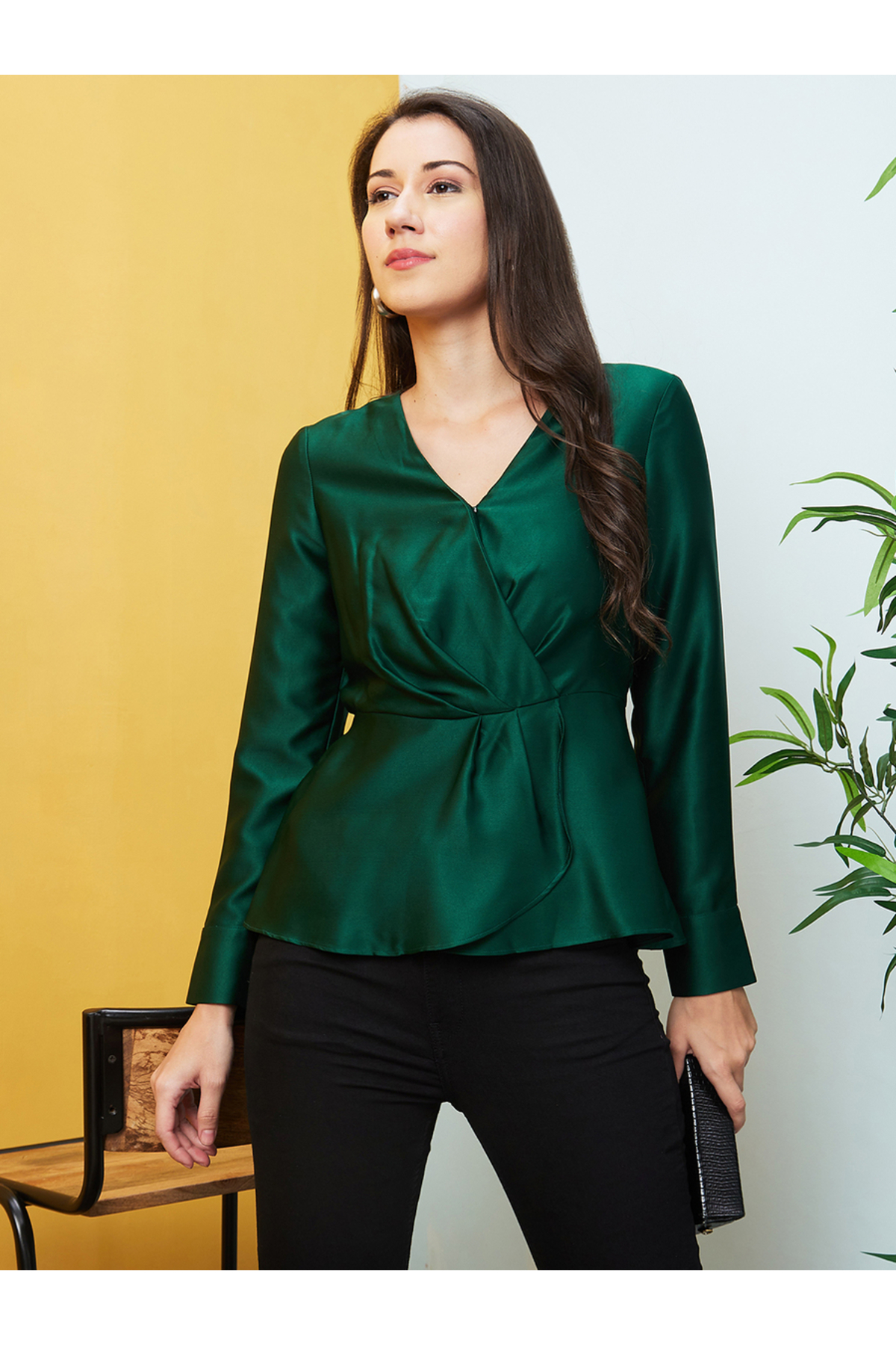 Globus By Styli بلوزة ملفوفة من الساتان الصلب بفتحة رقبة على شكل حرف V
