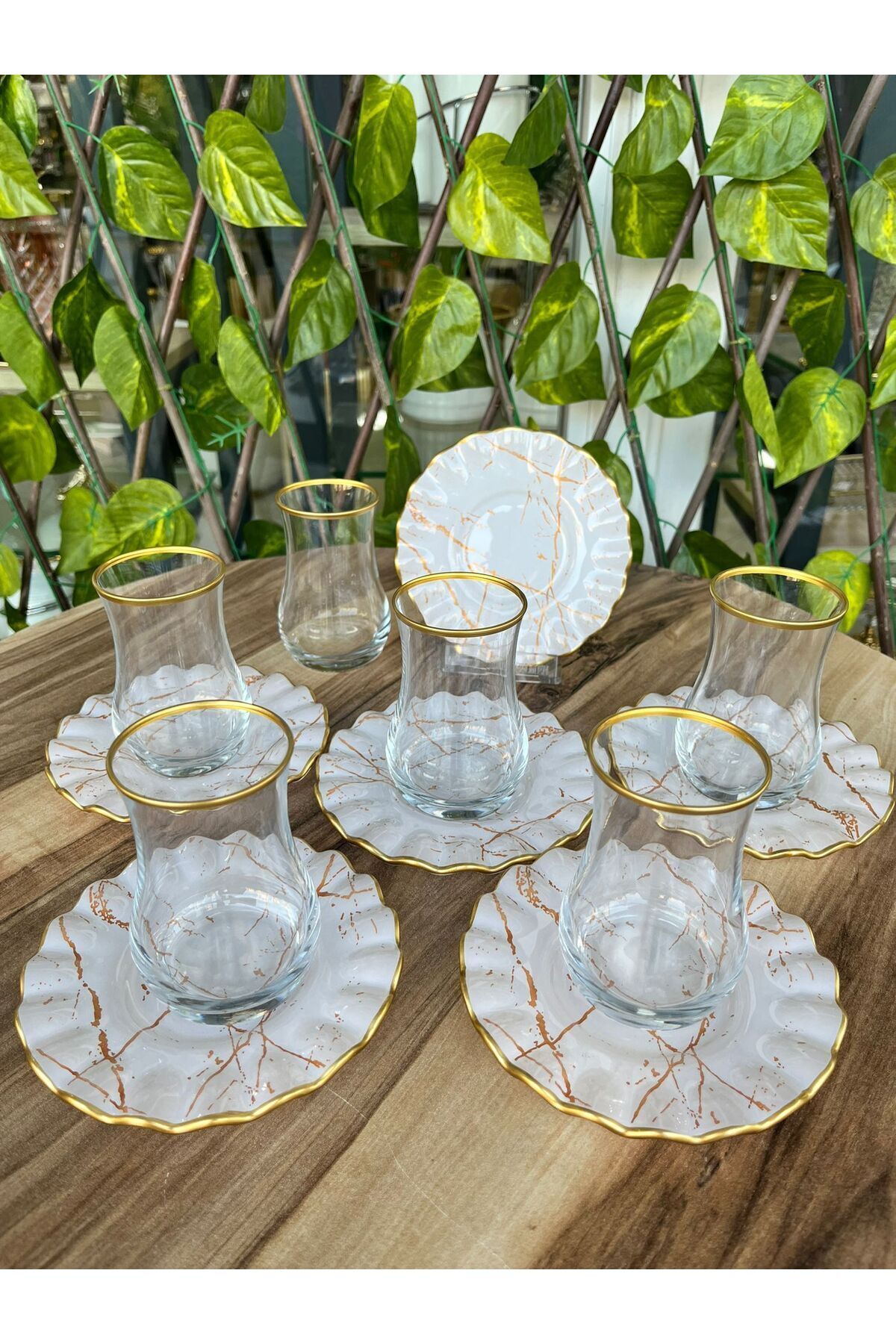 GÜRCÜGLASS طقم شاي أبيض مكشكش بنمط رخامي