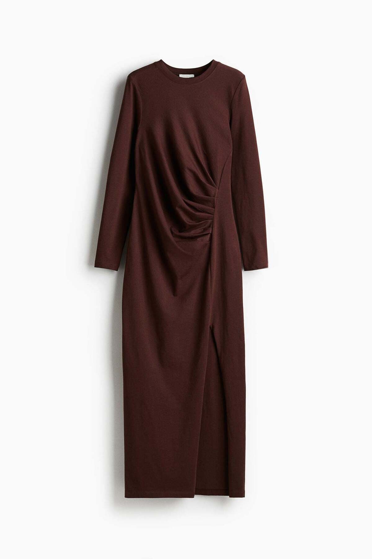 فستان اتش آند ام مصنوع من قماش الجيرسيه القطني الناعم الذي يضمن شعوراً مريحاً طوال اليوم. القماش لا يسمح فقط بتهوية جيدة، بل يوفر أيضًا راحة في الحركة، مما يجعله خيارًا مثاليًا للطقس الحار في منطقة الخليج.