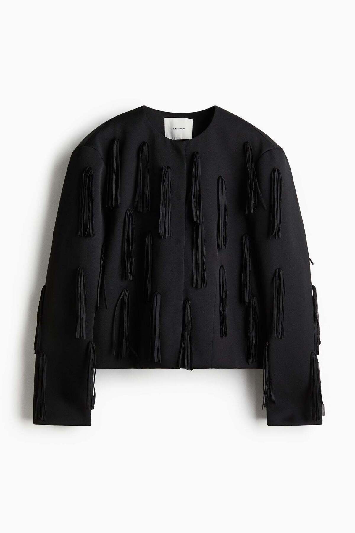 تمتاز السترة بتصميمها الفضفاض مع ياقة دائرية وأزرار كبس مخفية، مما يوفر مظهرًا أنيقًا ومتناسقًا. كما تحتوي على وسائد كتف تضيف لمسة من الأناقة. الحواف المُزينة تضفي حركة وحيوية على التصميم، مما يجعله خياراً رائعاً للإطلالات غير الرسمية.