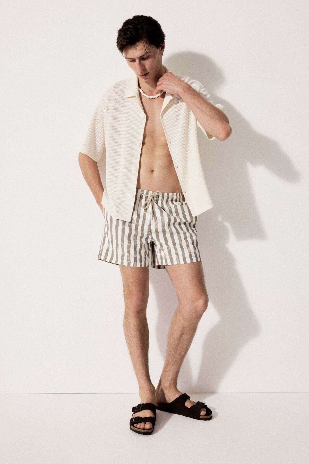 شورت السباحة من H&M مصنوع من نسيج خفيف وقابل للتمدد، مما يضمن راحة كبيرة أثناء الحركة. القماش مقاوم للكلور والملح، مما يجعله مثاليًا للاستخدام في البحر والمسابح.