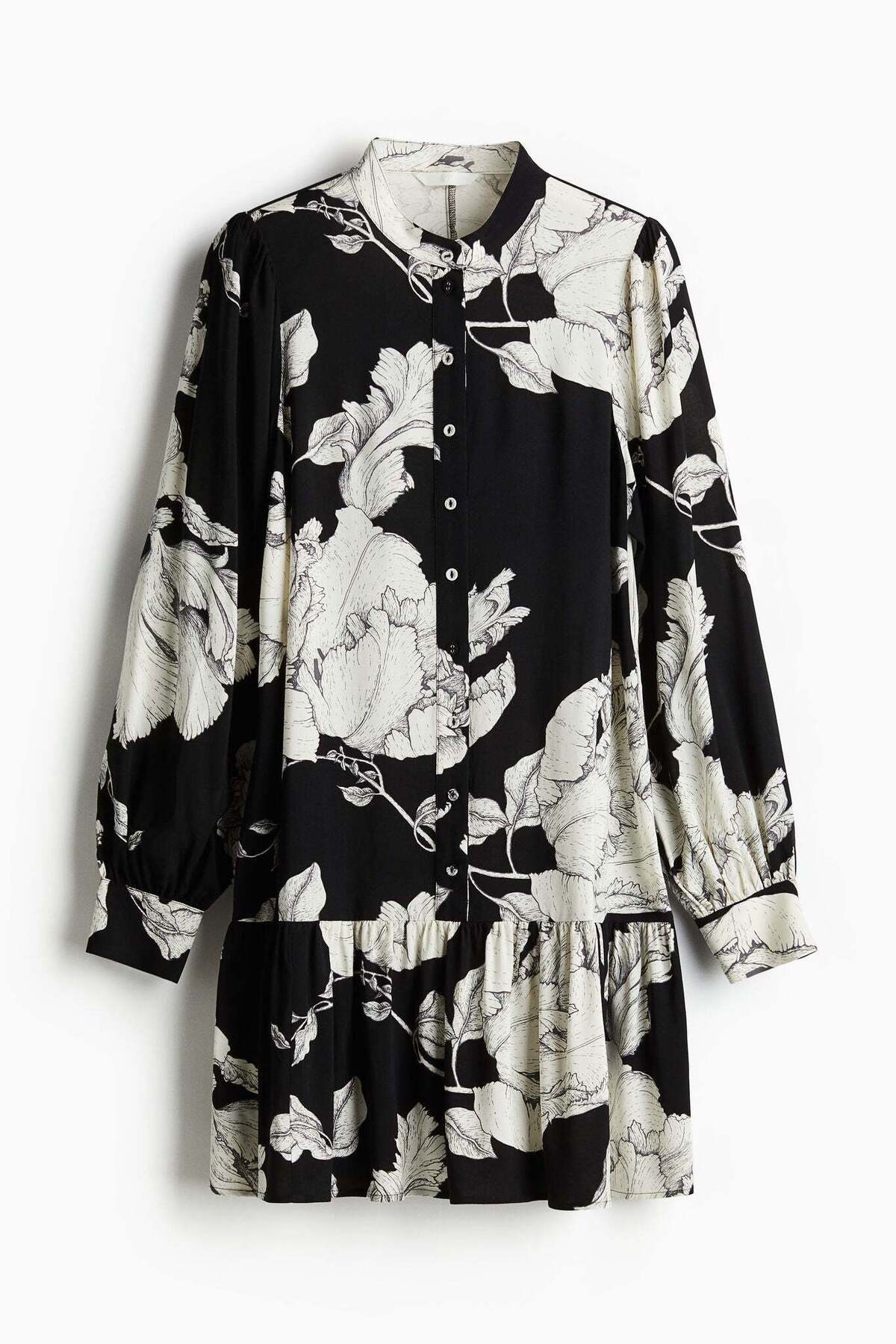 يأتي الفستان بقصة فضفاضة مع طوق شريطي وأزرار في الأمام، بالإضافة إلى أكمام طويلة منفوخة مع شق وأزرار عند الأكمام. هذه التفاصيل تعزز من جاذبية الفستان، مما يجعله مثالياً لتنسيقه مع إكسسوارات بسيطة.
