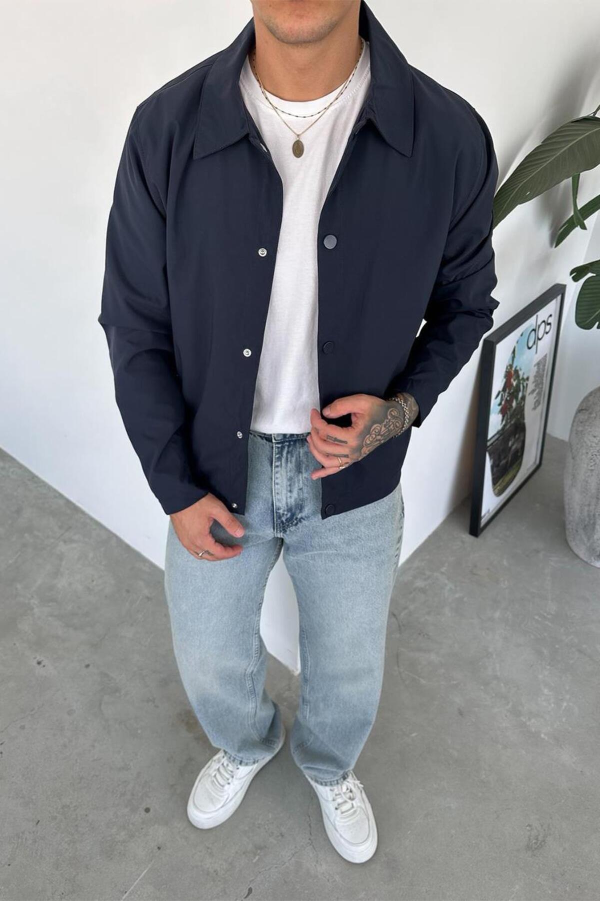 HAFKA سترة مريحة بأزرار كبس أساسية باللون الأزرق الداكن