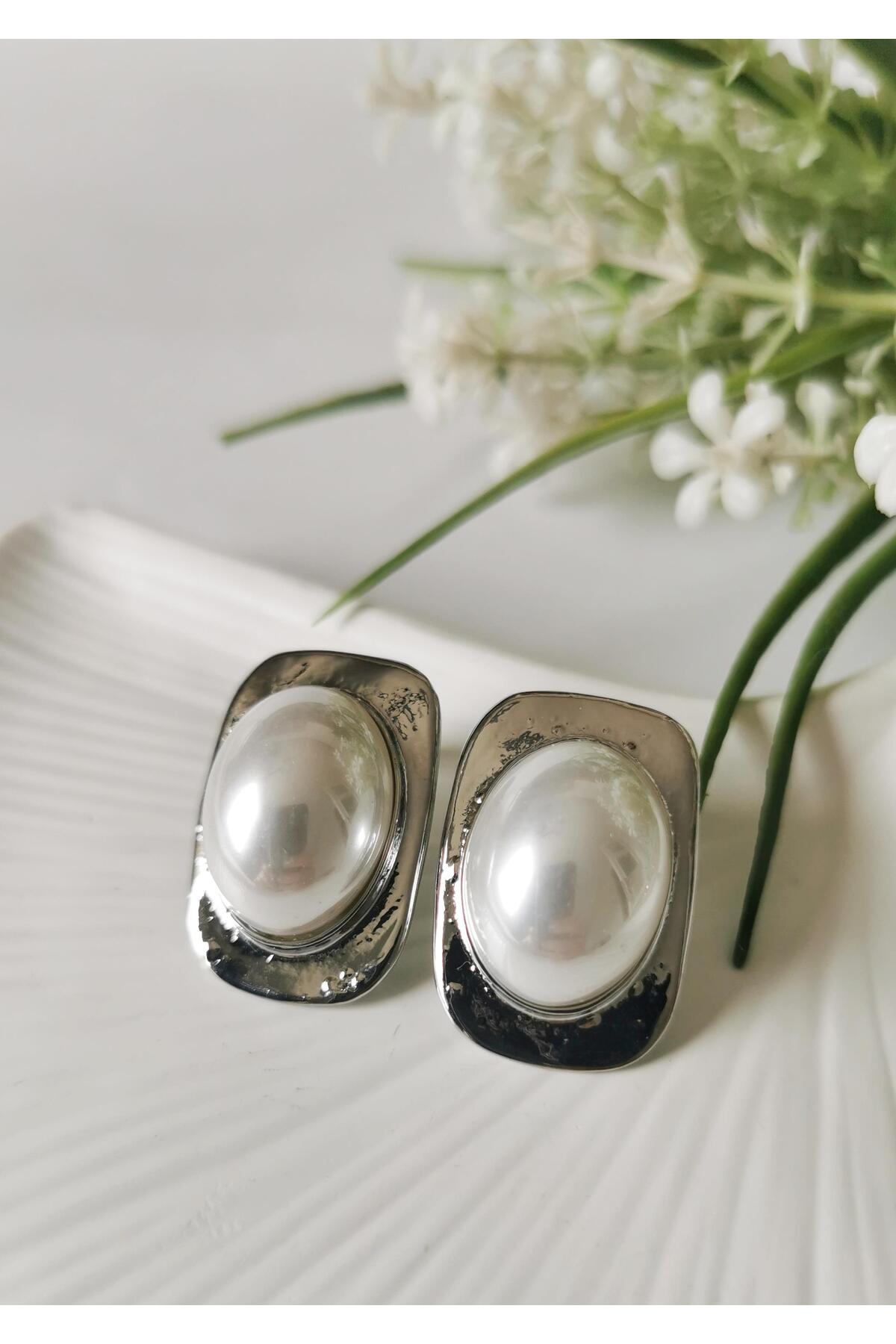 ميزات أقراط مستطيلة الشكل باللون الفضي مع تفاصيل من اللؤلؤ من Halley Concept