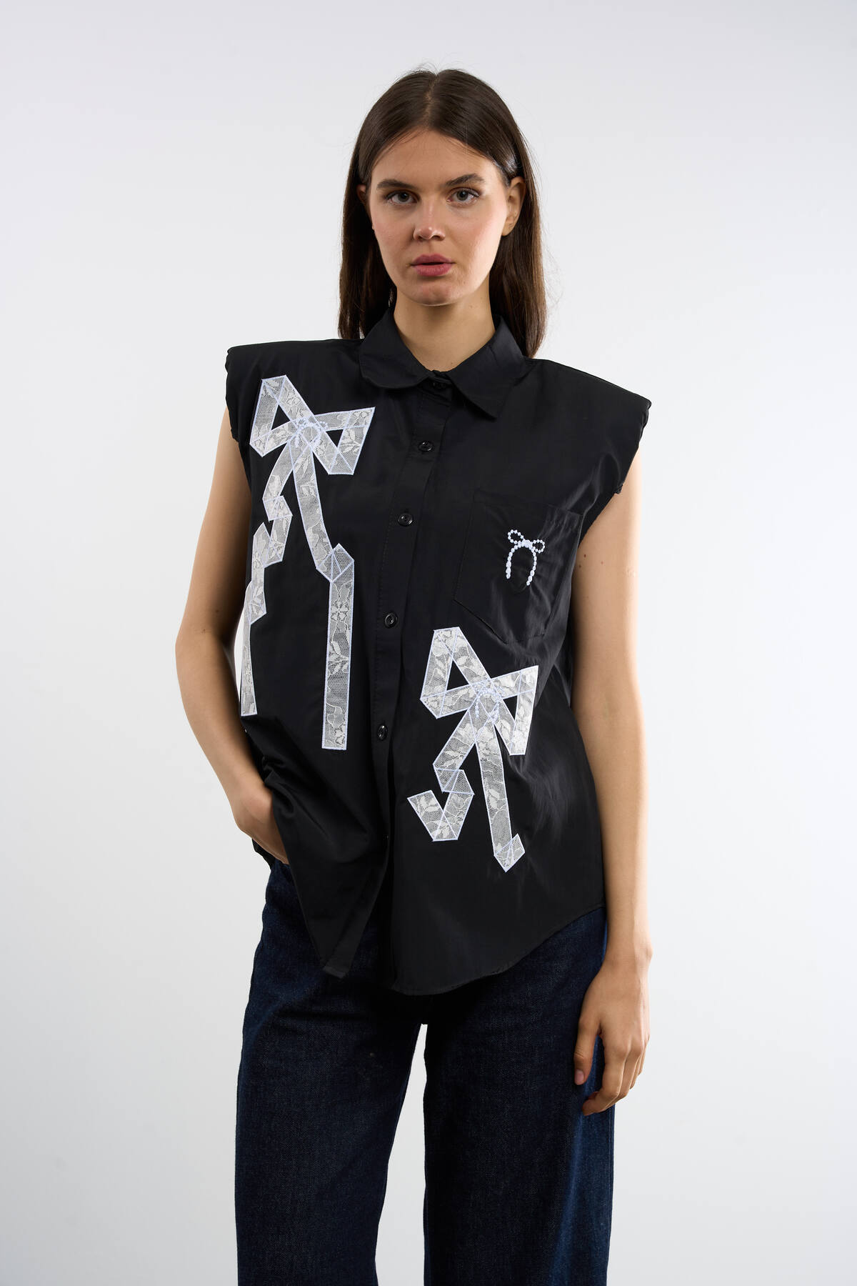 ميزات قميص بدون أكمام مطبوع عليه فيونك من HANIQA