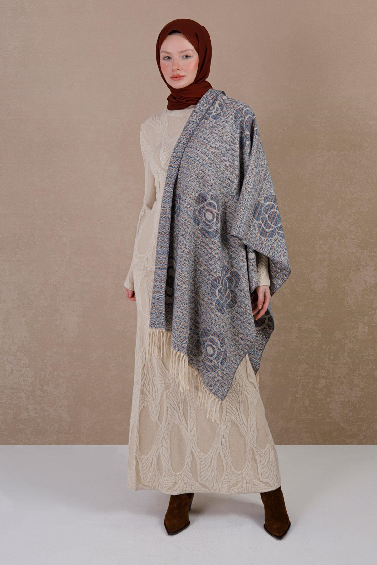 HERCHES وشاح شتوي من الصوف بنقشة الورد - أزرق